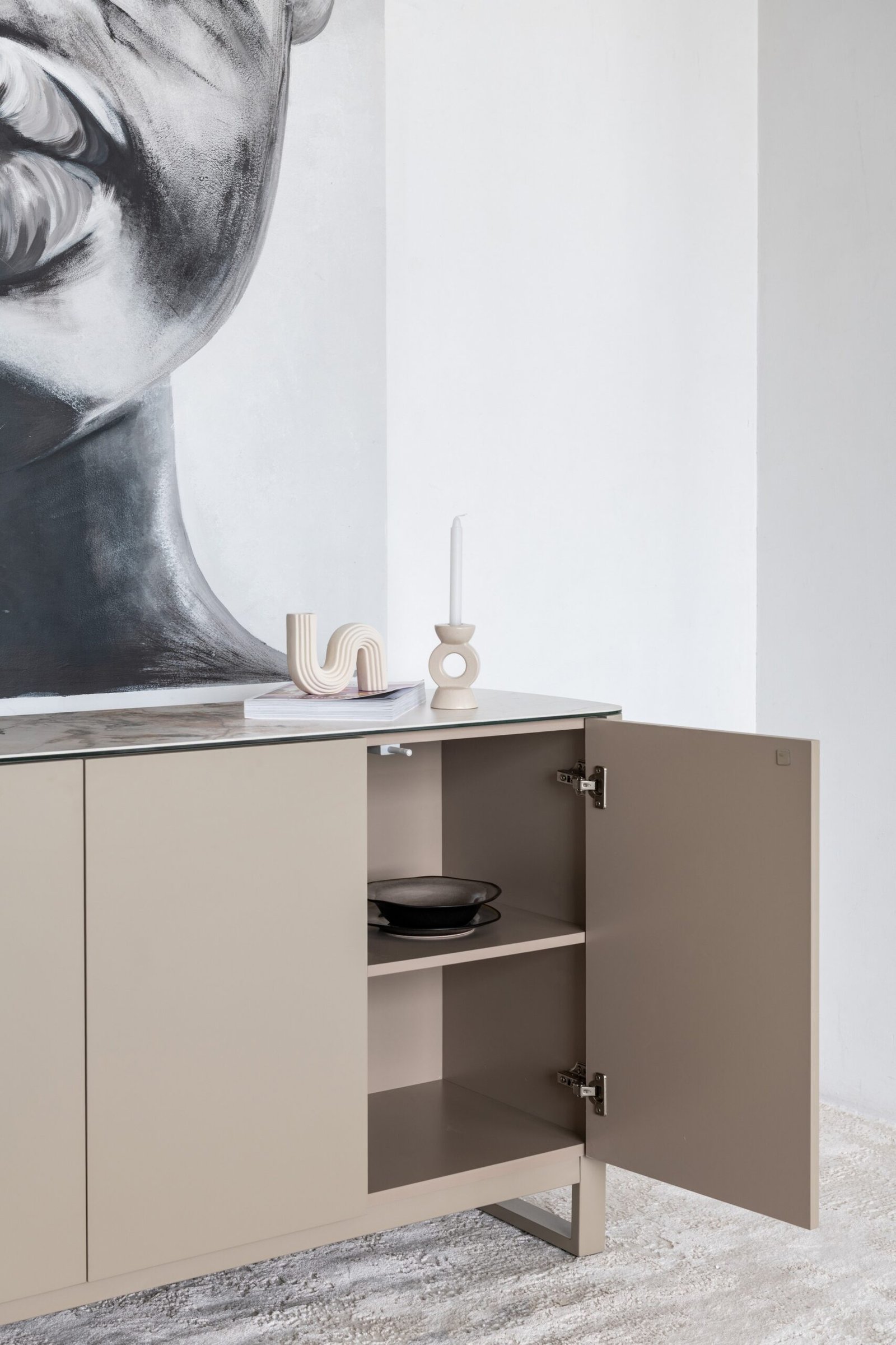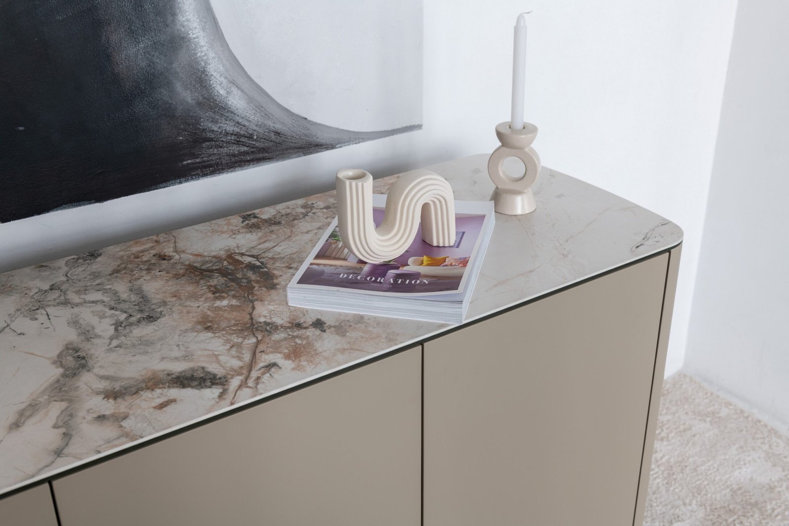 Стільниця виконана з матової кераміки та МДФ у витонченому відтінку аврора голд, що надає меблям благородного вигляду, а також забезпечує стійкість до пошкоджень і легкість у догляді.
