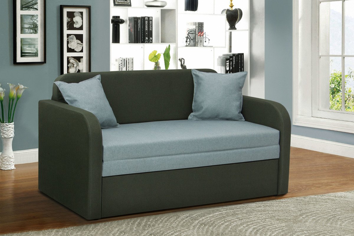 Характеристики:Ширина: 970 мм; Глибина: 800 мм. Висота спинки: 800 мм; Висота підлокітників: 650 мм; Товщина підлокітників: 85 мм; Висота посадки: 450 мм; Ширина спального місця: 800 мм; Довжина спального місця: 1950 мм Каркас: ДСП + ДВП + Дерево. Наповнення: Поролон 25-ї щільності товщиною 100 мм на ламелях. В комплект входить дві подушки розміром 40*40мм. Також є ніша для білизни.Матеріал оббивки в складській програмі (поєднання тканин) Аляска 37/Аляска 72 ( Exim Textil)