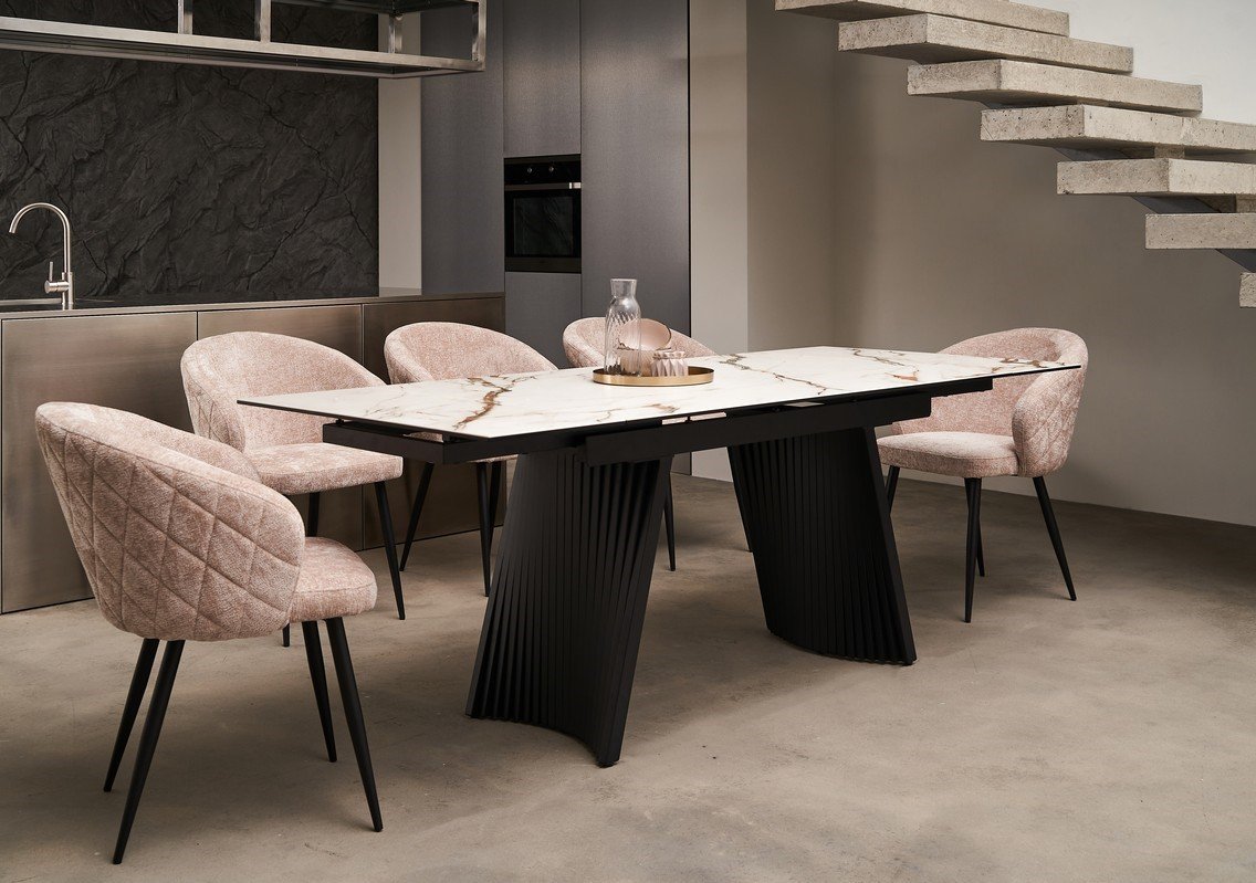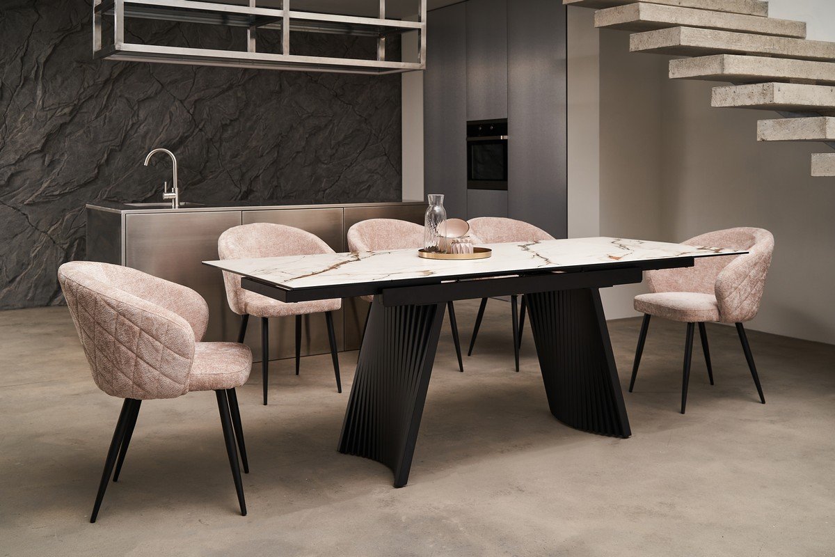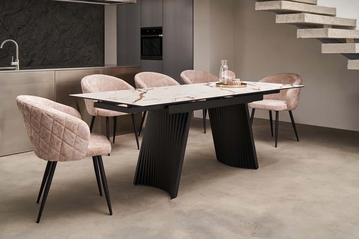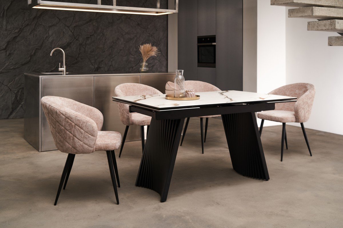 Механізм розкладки боковий дозволяє легко збільшити довжину столу з 140 см до 210 см, що надає йому універсальності та дозволяє комфортно розмістити більшу кількість гостей. Основа з фарбованого металу забезпечує стабільність конструкції та гармонійно поєднується з елегантною стільницею.