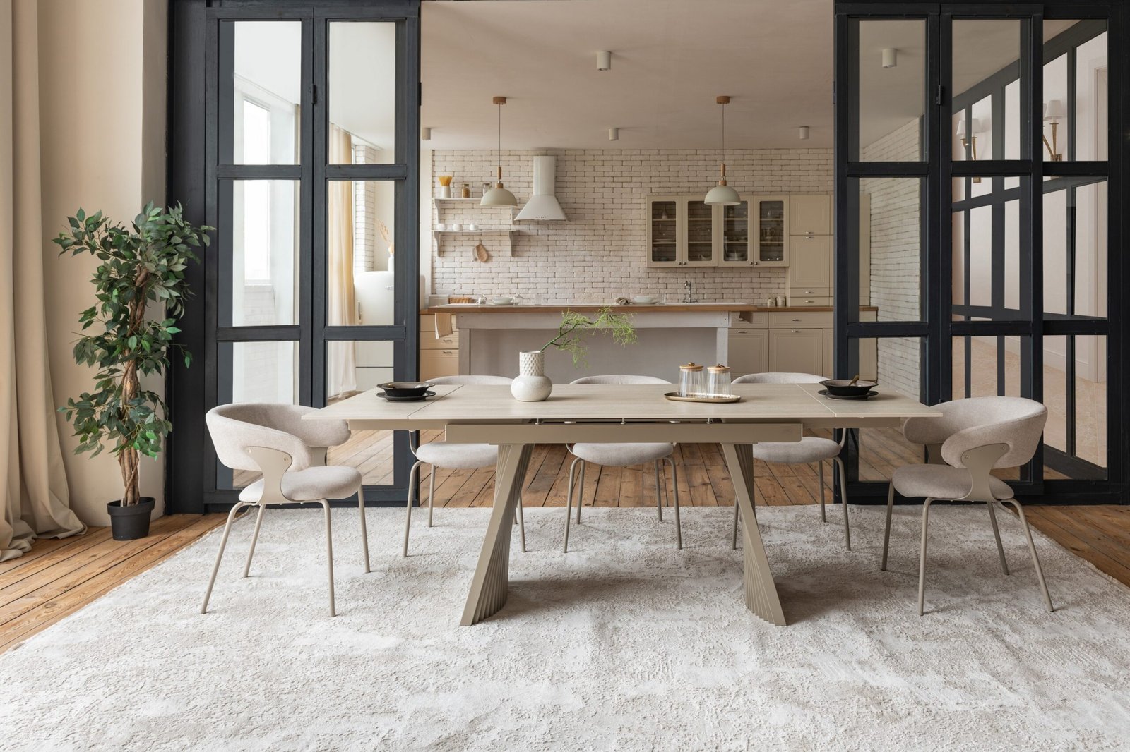 Міцна металева основа, пофарбована у витриманий бежевий колір, забезпечує надійну стійкість та довговічність. Завдяки боковому механізму розкладки довжина столу змінюється від 140 до 210 см, що робить його ідеальним вибором для зустрічей у колі сім’ї чи прийому гостей.