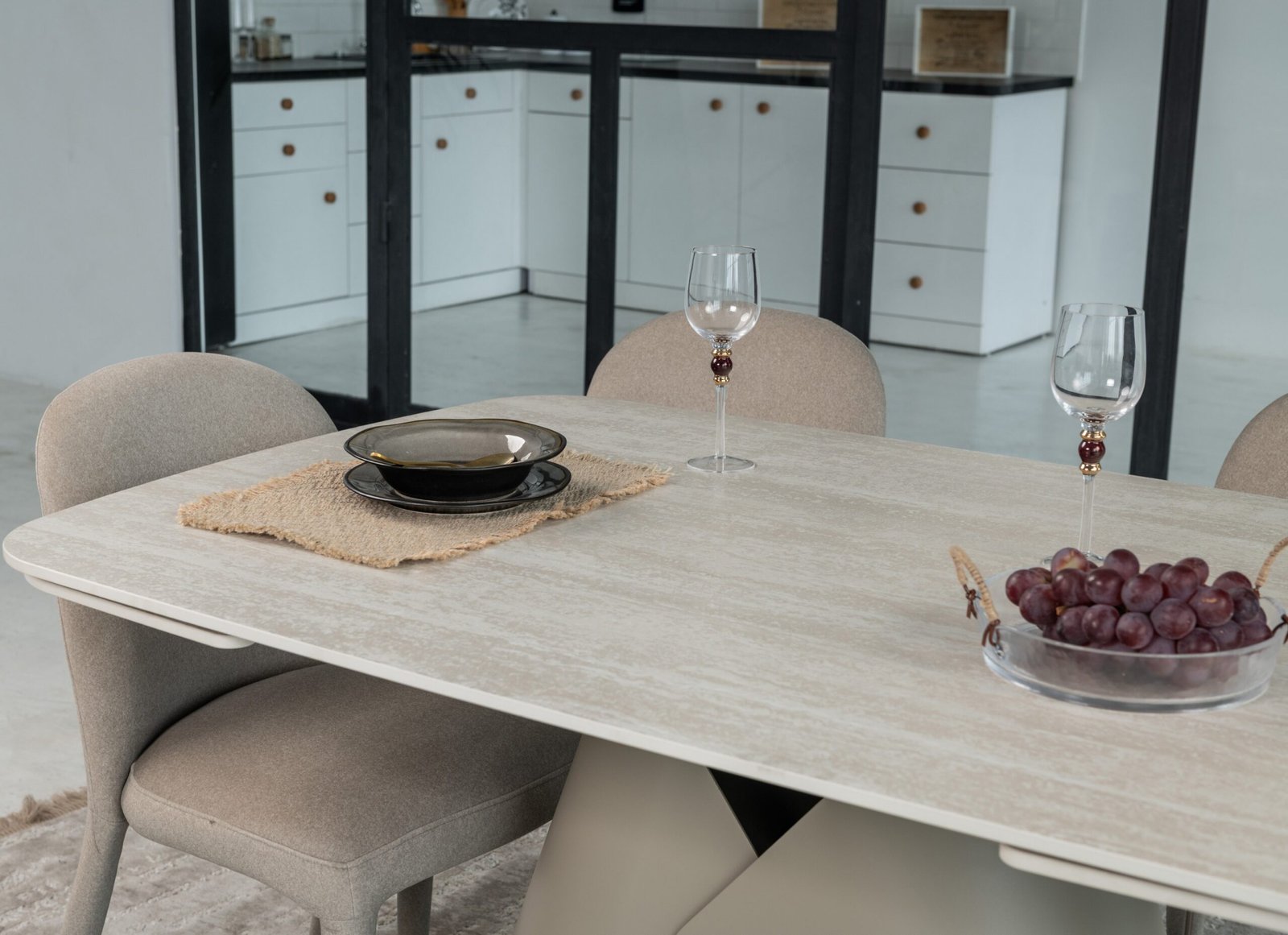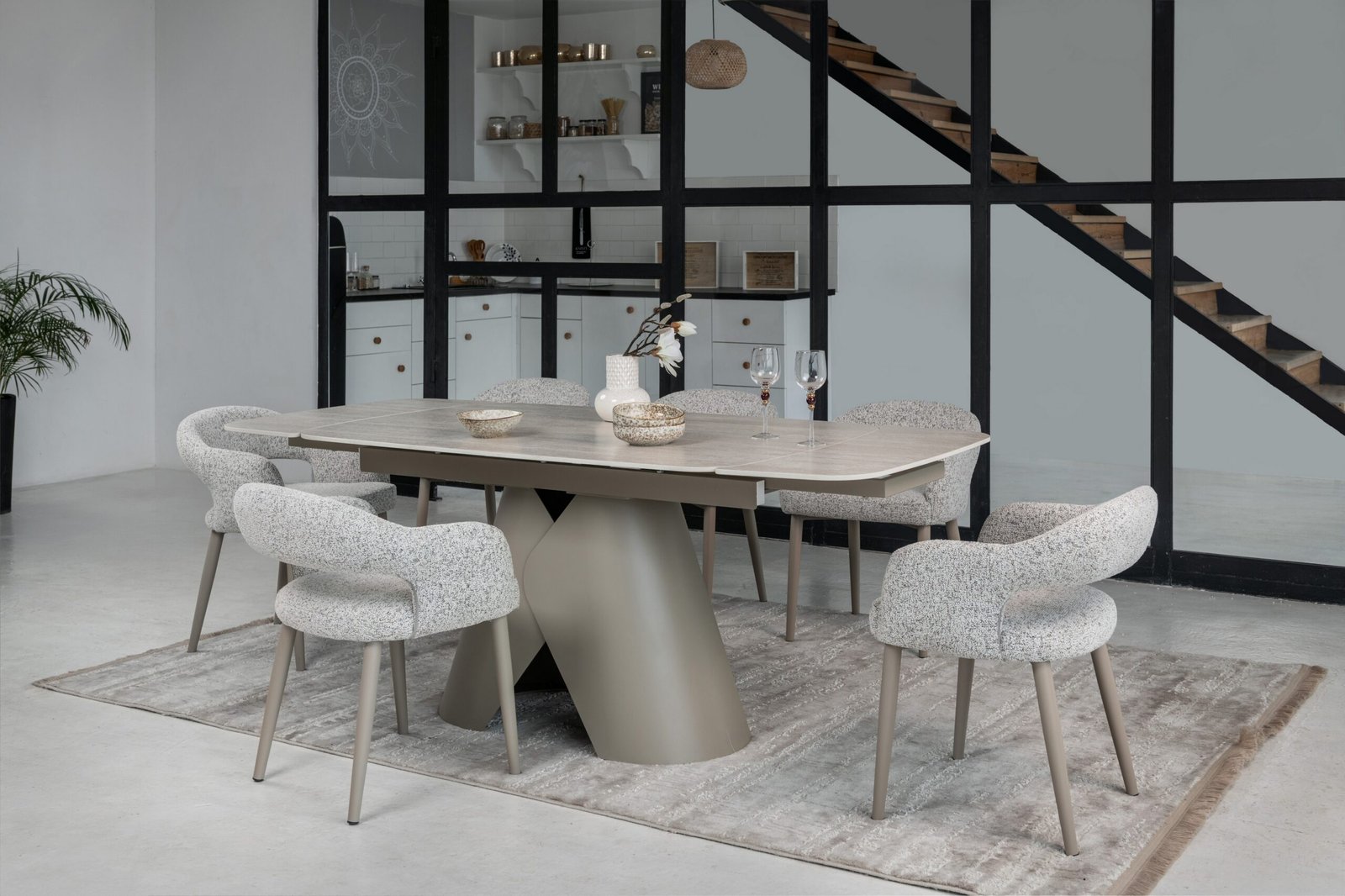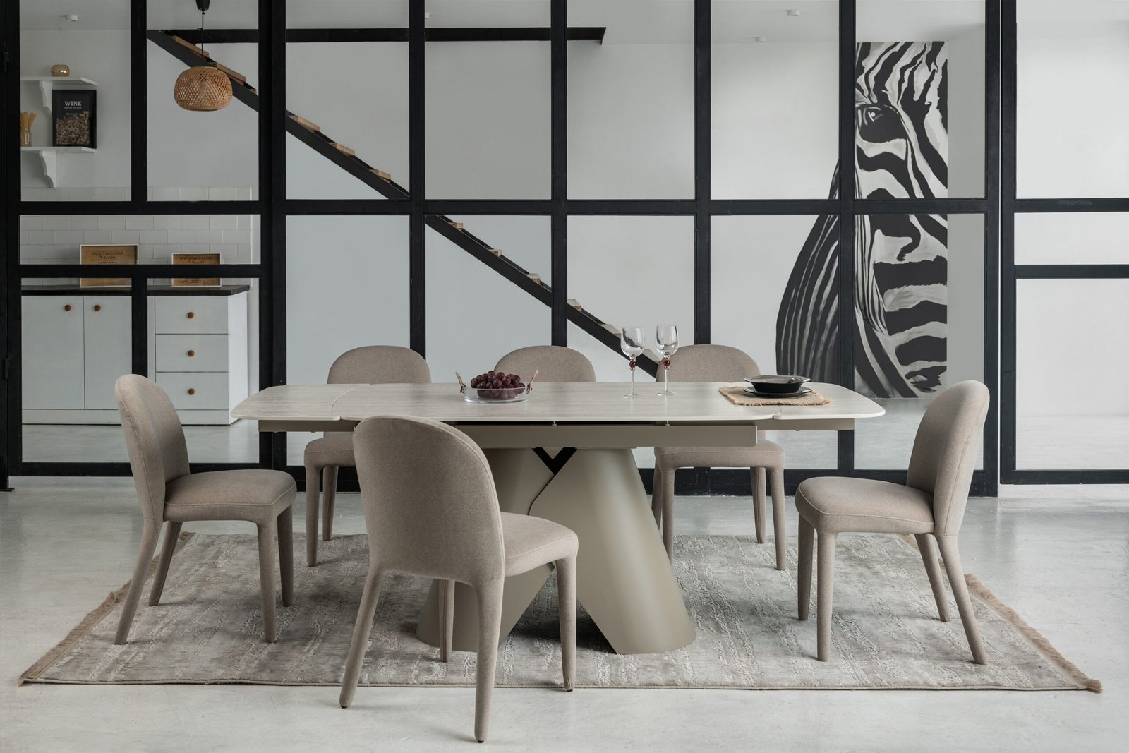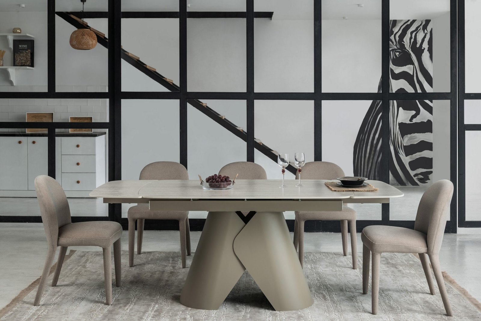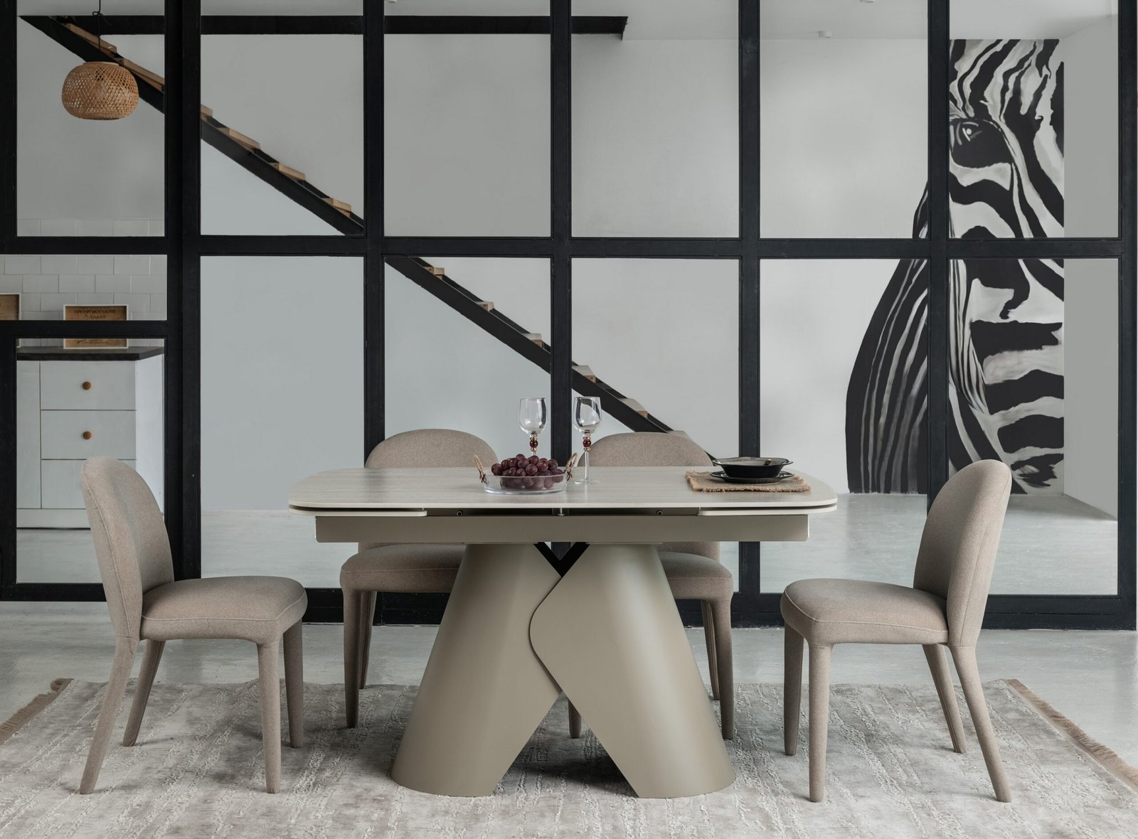 Міцна металева основа, пофарбована у благородний бежевий колір, забезпечує надійну стійкість та гармонійно доповнює дизайн. Завдяки боковому механізму розкладки стіл легко трансформується з 140 до 200 см, що дозволяє зручно розмістити гостей під час святкових зустрічей.