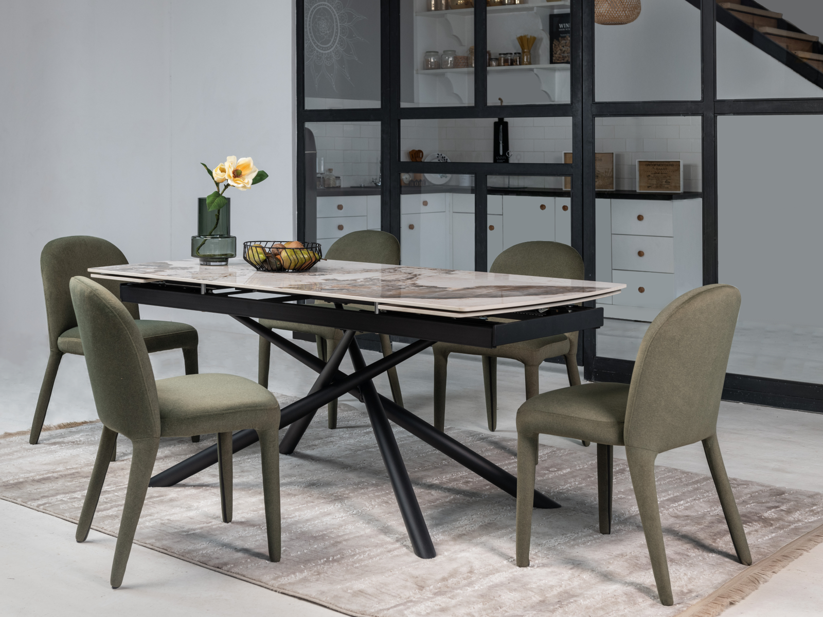Кераміка в кольорі патагонія з природними прожилками виглядає розкішно та елегантно, а чорна металева основа додає контрасту, підкреслюючи сучасний стиль. Це поєднання створює враження витонченості та елегантності.