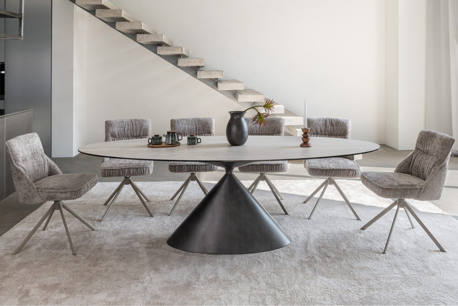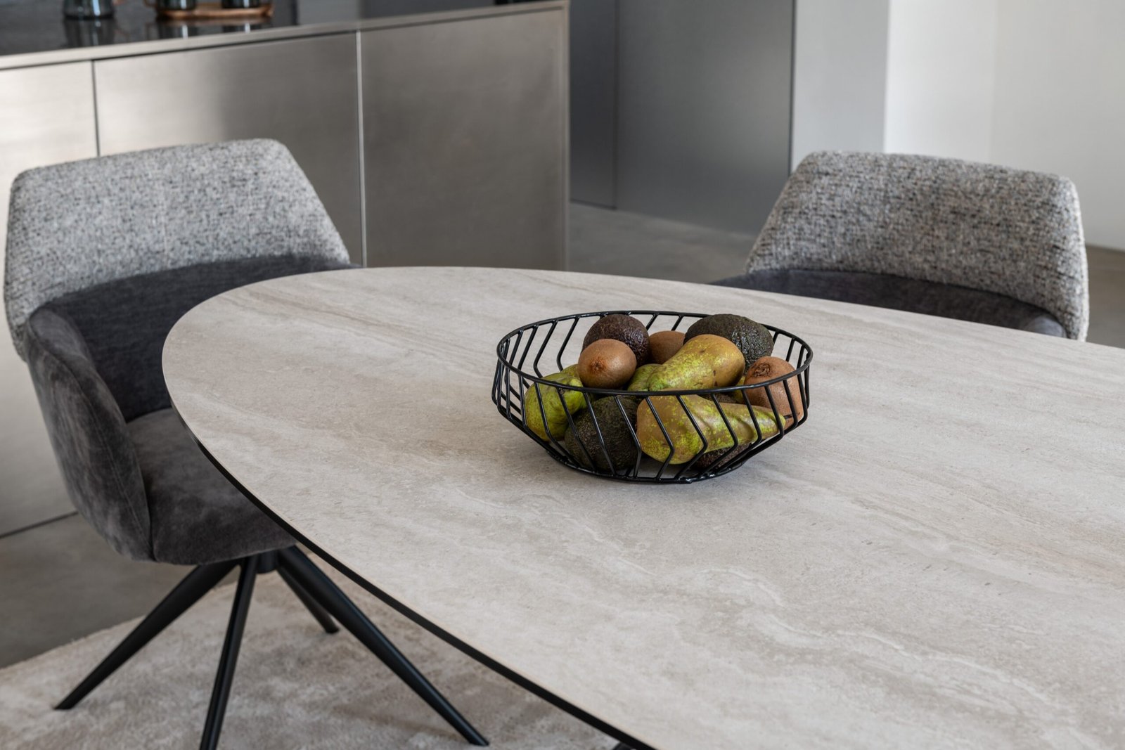 Колір “грей травертін” — це витончені сіро-бежеві відтінки з природним кам’яним ефектом, що створює спокійну атмосферу розкоші та гармонії в будь-якому просторі. Чорна металева основа додає столу сучасного вигляду, забезпечуючи його стабільність і надійність.