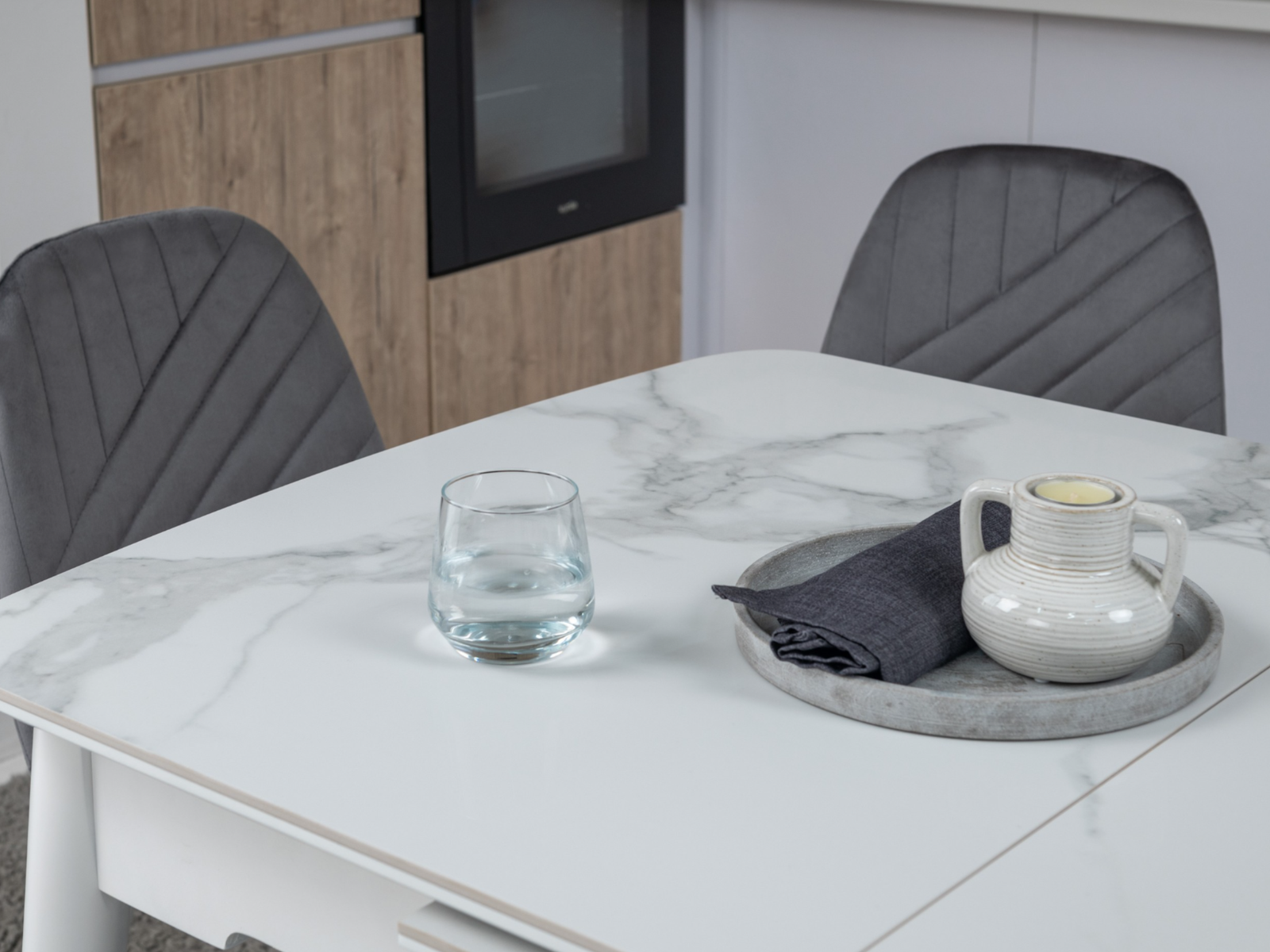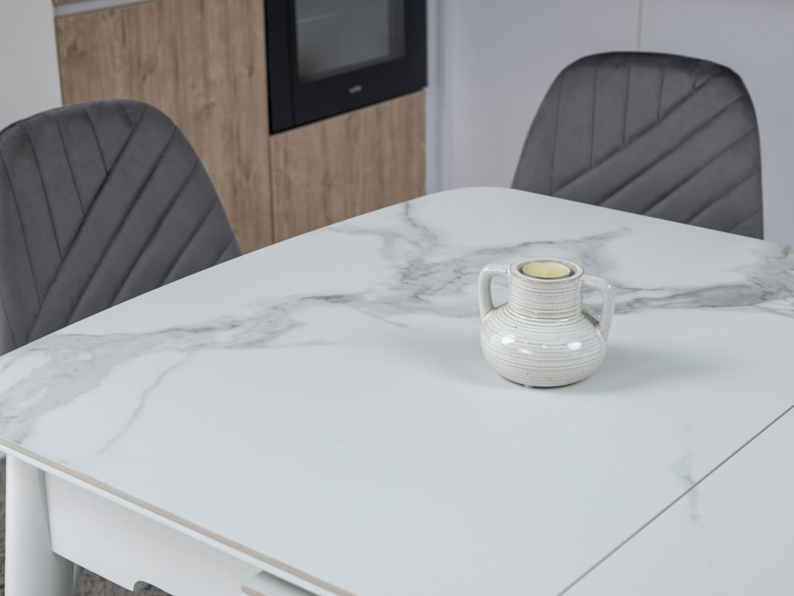 Столешня виготовлена з глянцевої кераміки та матового МДФ, а вкладка – з глянцевої кераміки та матового МДФ. Основа столу виконана з фарбованого дерева, що забезпечує міцність та стійкість.