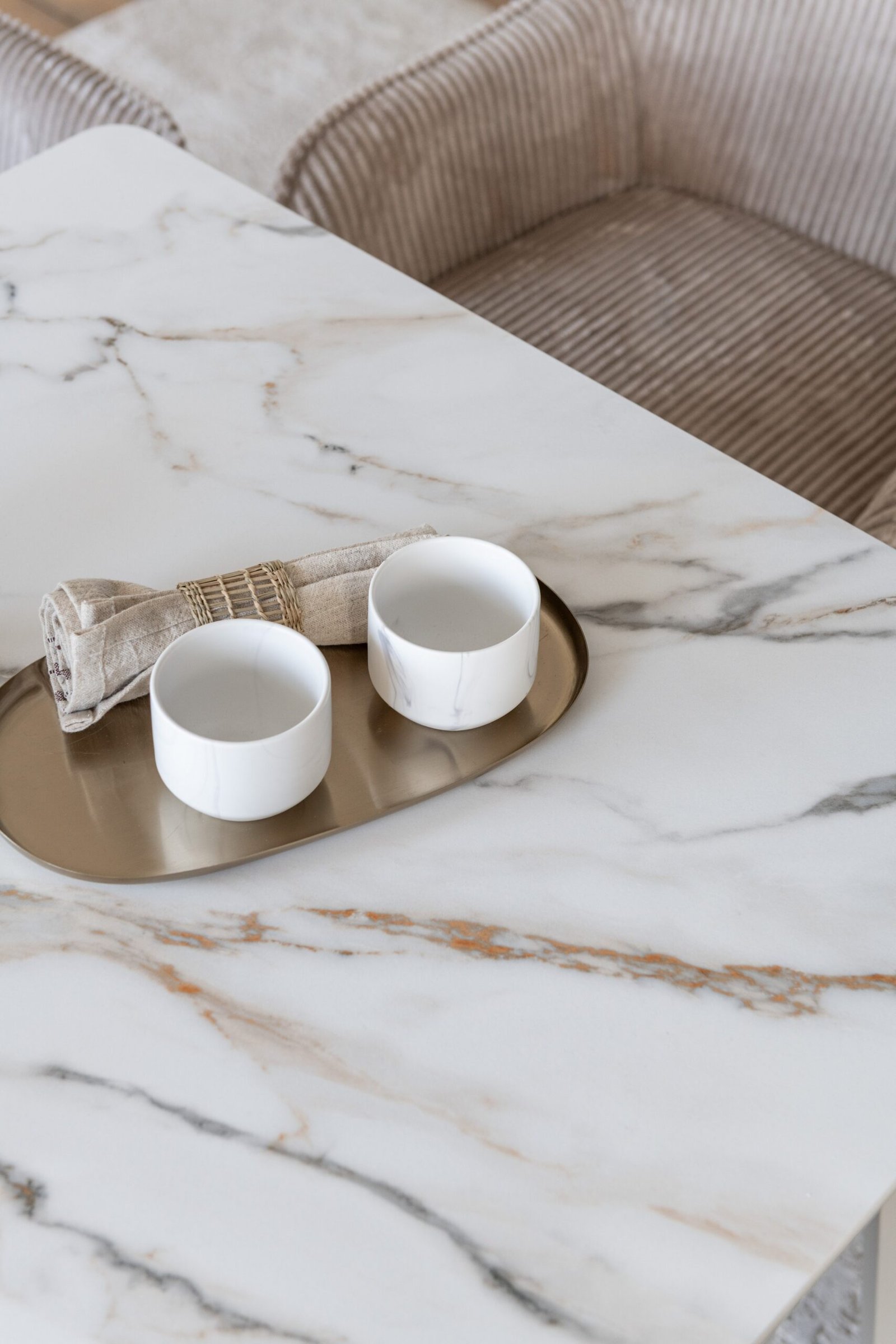 Стільниця виконана з матової кераміки у комбінації з матовим МДФ — практичне й стильне рішення, стійке до подряпин та високих температур. Основа з пофарбованого дерева забезпечує надійність та стабільність конструкції.