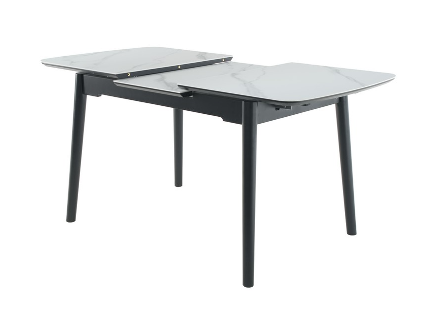 Стільниця та вкладка виготовлені з матової кераміки та матового МДФ, що надає їм елегантного та сучасного вигляду. Колір «білий мармур» імітує природний камінь з його характерними прожилками і відтінками, додаючи столу вишуканості. Матова поверхня запобігає появі блисків, створюючи м’яку та затишну атмосферу.