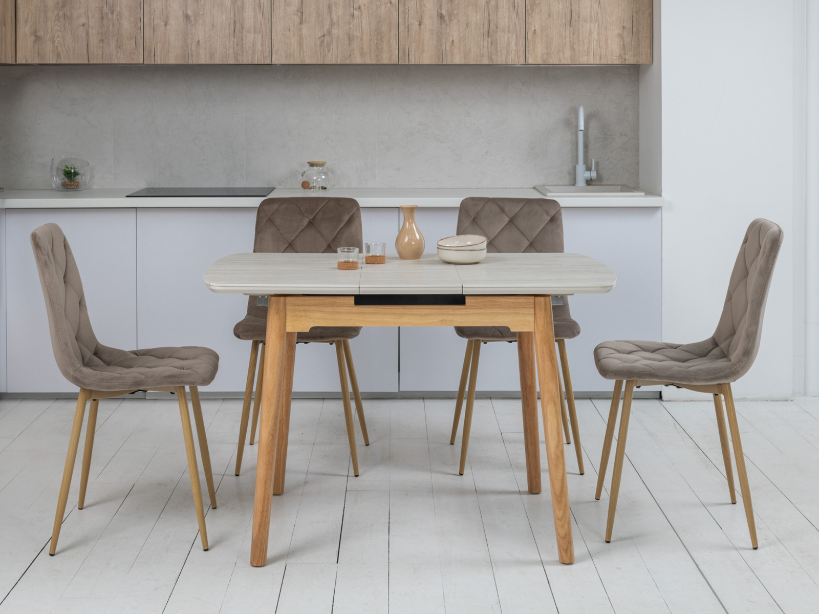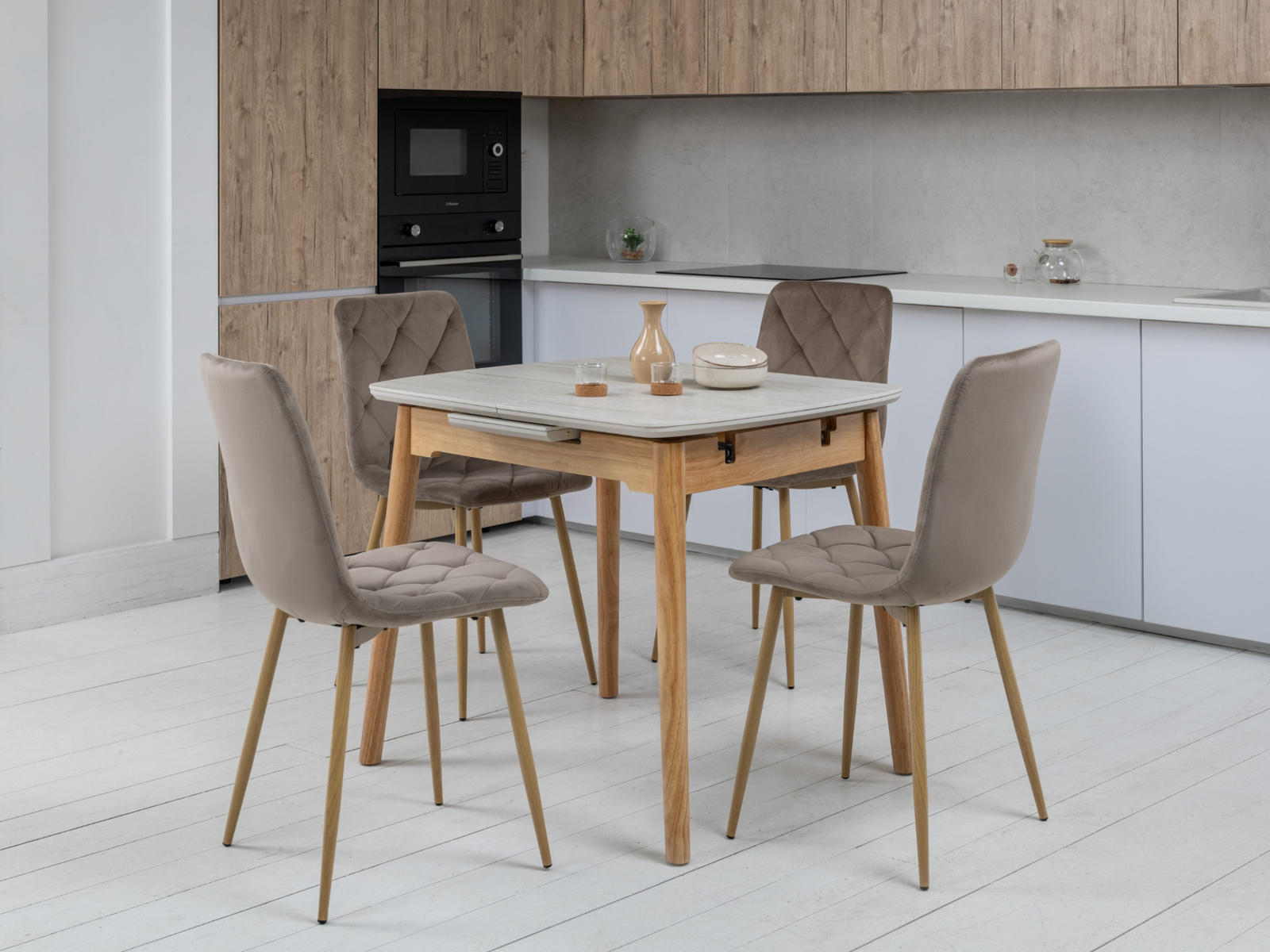 Стільниця виконана з матової кераміки кольору травертин, яка нагадує натуральний камінь з його характерними текстурами і м’якими відтінками. Матова поверхня надає столу витончений вигляд і запобігає появі відблисків, що робить його чудовим вибором для створення затишної атмосфери.
