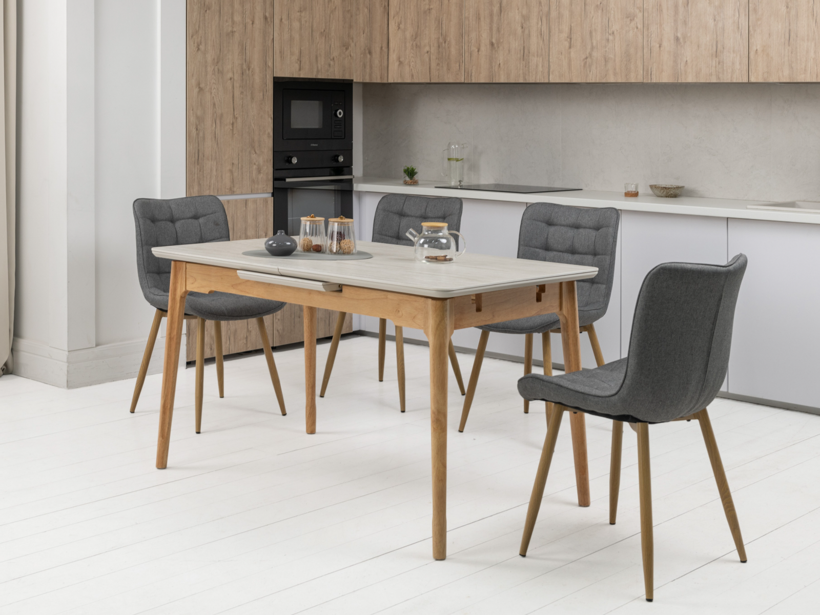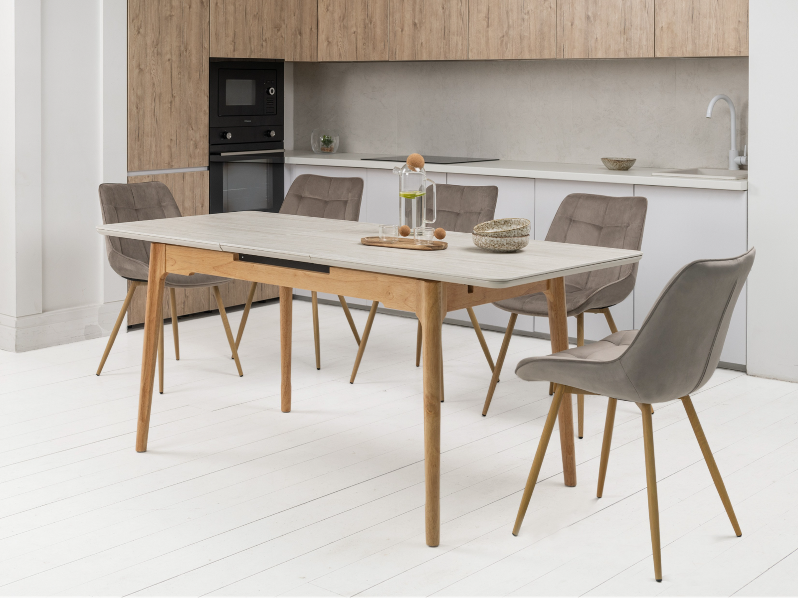 Стільниця та вкладка виготовлені з матової кераміки та матового МДФ, що надає їм сучасного вигляду та робить поверхню приємною на дотик. Кераміка кольору “травертін” імітує природний камінь, додаючи столу особливого шарму і витонченості. Матова поверхня не відбиває світло, що створює теплу та затишну атмосферу.