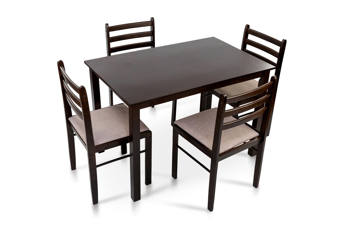Комплект обідній Джерсі – це готове рішення для оформлення вашої обідньої зони. 4 стільці і стіл складуть головний акцент приміщення, завдяки натуральним матеріалам, внесуть гармонію і домашній затишок. Доступні кольори: білий, сірий та темний горіх. Даний комплект підійде для будинку або готельної їдальні. Прямокутні форми створені для сучасних і класичних інтер’єрів. Стіл з масиву дерева (гевея), ніжки товщиною 45х45 мм, стільниця з міцного і практичного МДФ покритого натуральним шпоном/або фарбована. Стілець також з масиву дерева, сидіння м’яке, оббивка з тканини, яка швидко і просто чиститься в разі потреби.