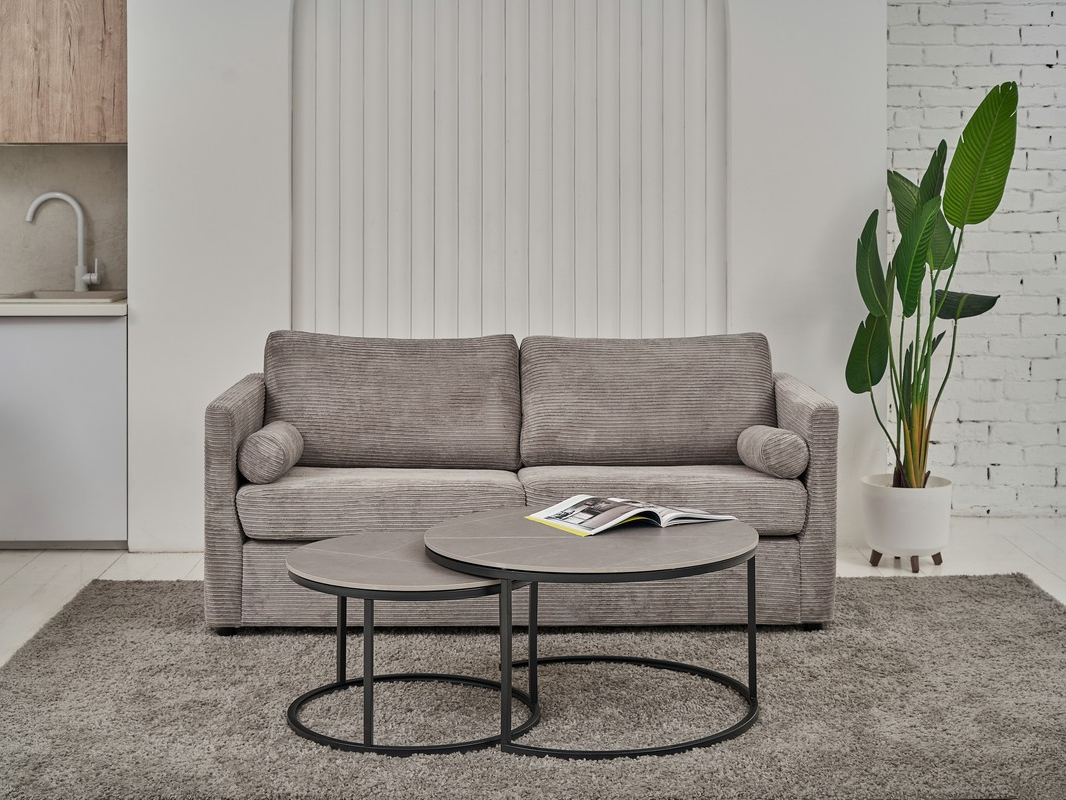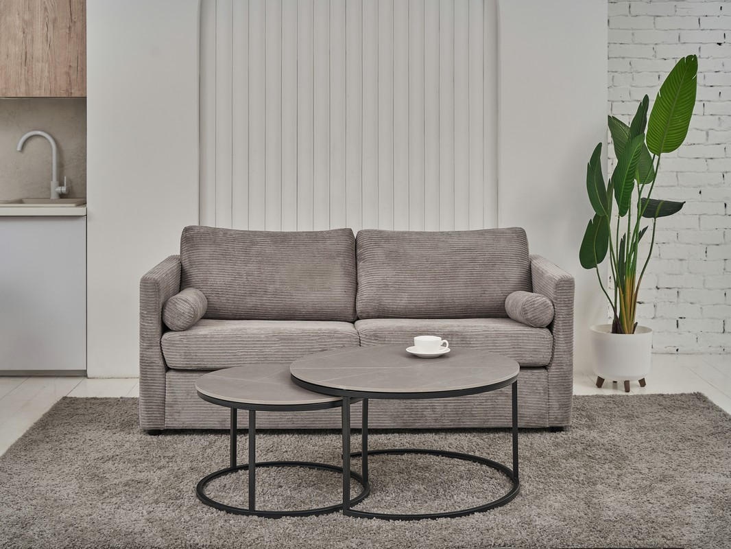 Комплект журнальних столів CT-35 Лоренза в кольорі “петра грей” з чорним поєднує сучасний дизайн та функціональність, надаючи вашому інтер’єру елегантності. Набір складається з двох круглих столів різного діаметра, які можна використовувати разом або окремо, залежно від ваших потреб і простору.