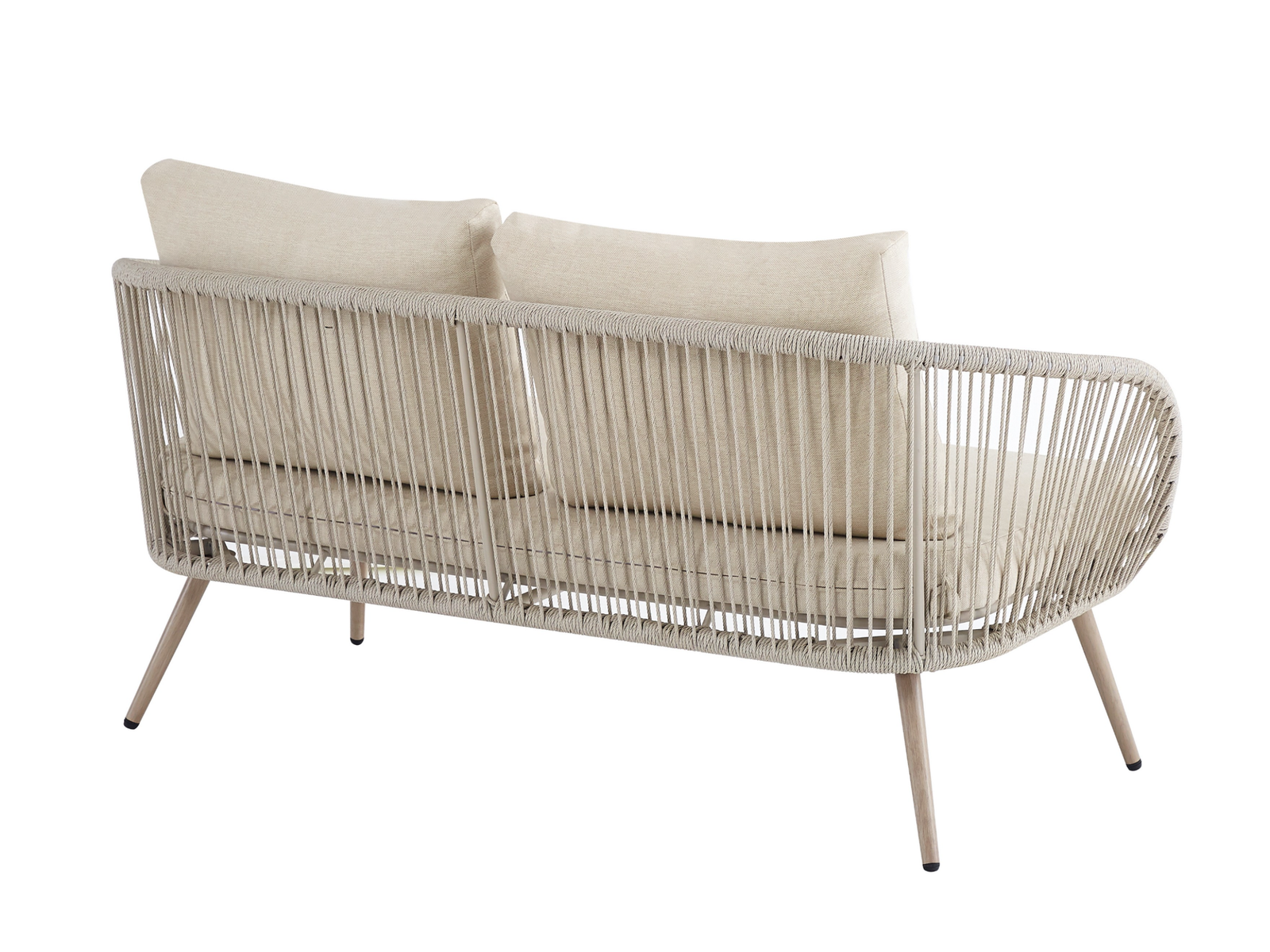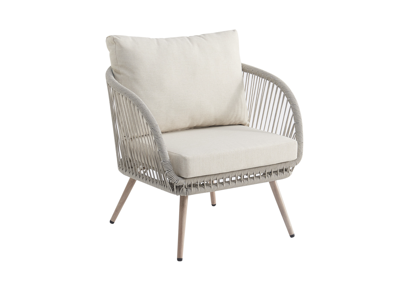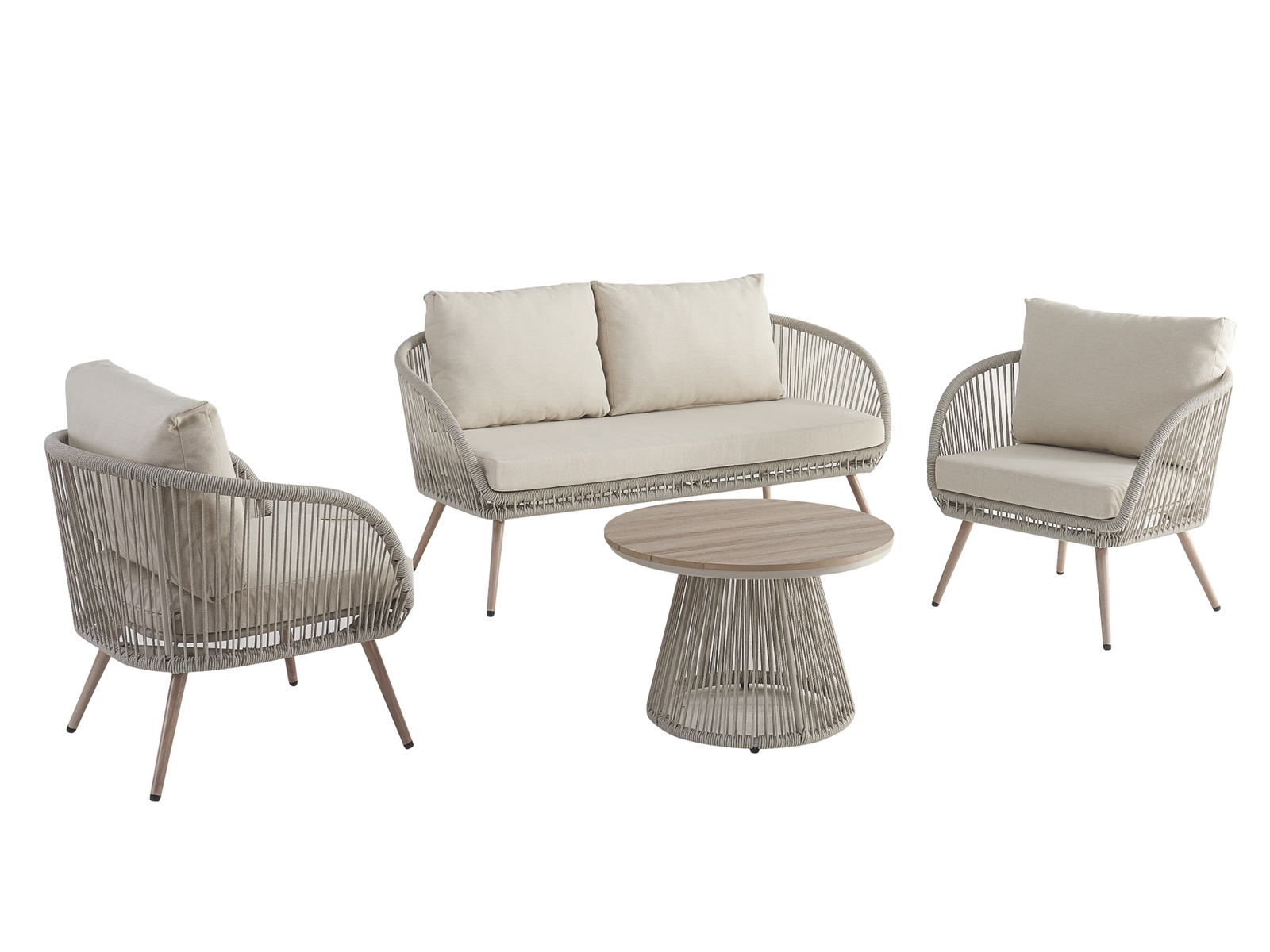 Стільниця виготовлена з деревополімерного композиту — практичного матеріалу, який поєднує естетику натурального дерева та стійкість до вологи, сонця і перепадів температур. Основа столика та каркаси дивана і крісел виконані з фарбованої оцинкованої сталі в поєднанні зі штучним ротангом, що забезпечує міцність, довговічність і стійкість до зовнішніх впливів. Ніжки зі сталі мають декоративне покриття під дерево, яке підкреслює природну стилістику комплекту. Розмір столика: діаметр 66 см, висота 43 см.