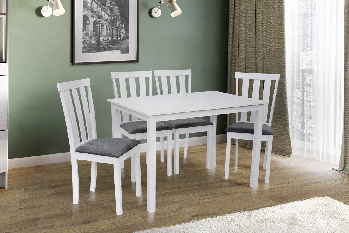 Комплект обідній Юджин – це готове рішення для оформлення вашої обідньої зони. 4 стільці і стіл складуть головний акцент приміщення, завдяки натуральним матеріалам, внесуть гармонію і домашній затишок. Доступні кольори: білий та темний горіх. Даний комплект підійде для будинку або готельної їдальні. Форми комплекту створені для сучасних і класичних інтер’єрів. Стіл з масиву дерева (гевея), ніжки товщиною 45х45 мм, стільниця з міцного і практичного МДФ покритого натуральним шпоном/або фарбована. Стілець також з масиву дерева, сидіння м’яке, оббивка з тканини, яка швидко і просто чиститься в разі потреби.