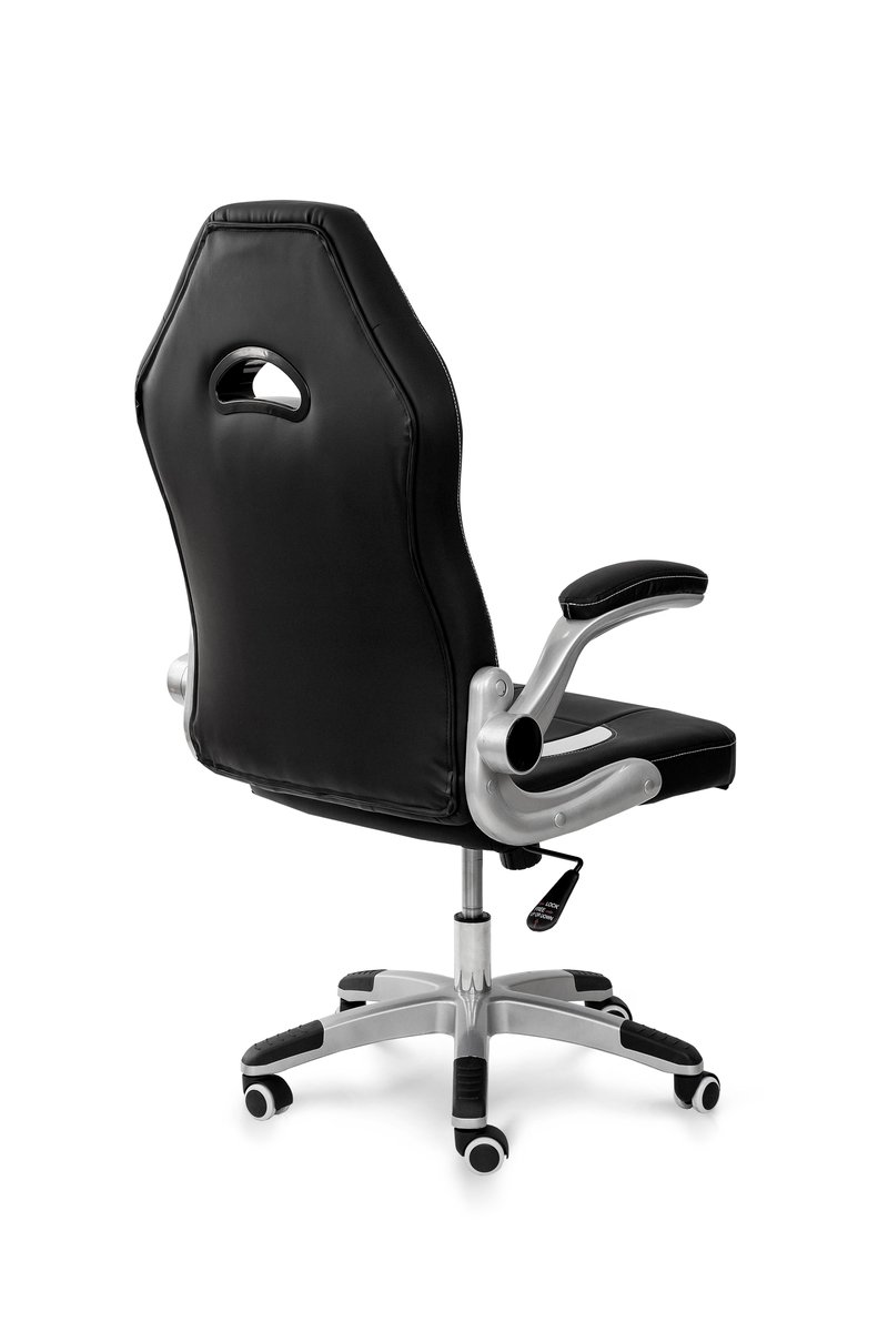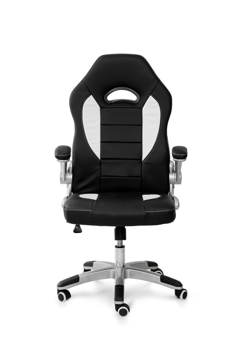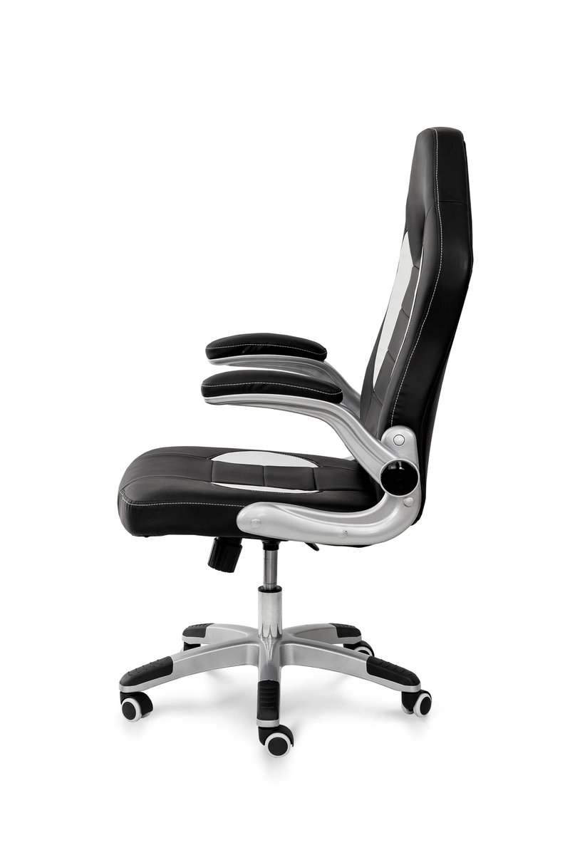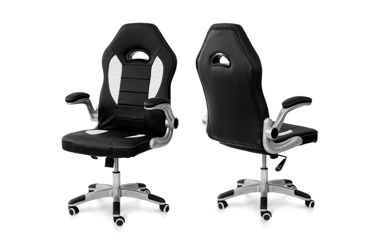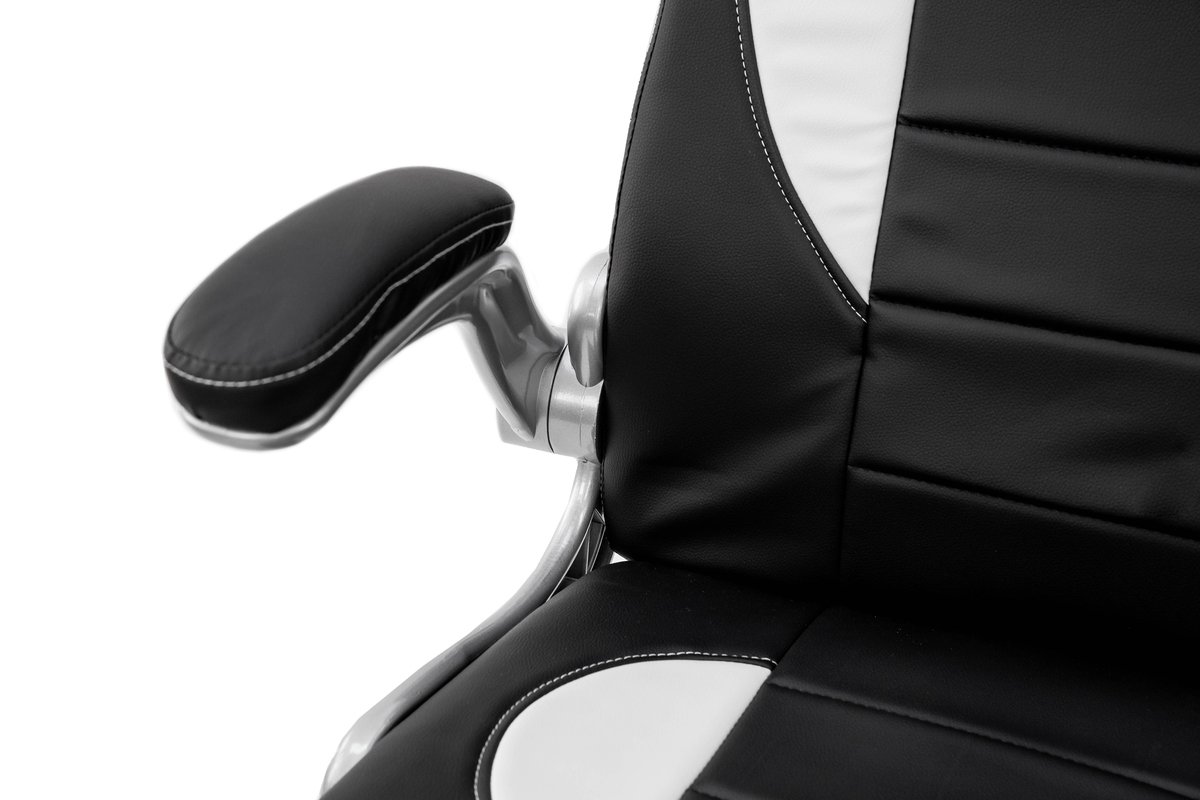 Розмір: Висота стільця (нижнє положення): 113 см; Висота сидіння в нижньому положенні: 41 см; Сидіння: Ш – 50 см, Г: 49 см; Спинка: В – 71 см; Висота підлокітників: 23 см; Висота підйому механізму: 10 см; Ширина виробу: 63 см; Глибина виробу: 52 см; Колір: Каркас: Хром; Сидіння: Чорний/Білий, Оббивка: шкірзам Матеріал: Каркас: Метал; Сидіння: Фанера гнутоклеєна Ніжки – метал, хром Підйомний механізм – газліфт