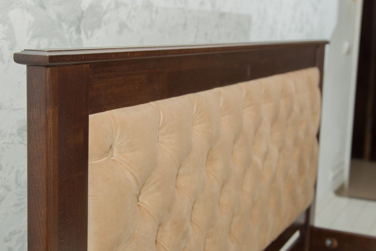 Розмір: Доступні розміри під матрац: 1200*2000; 1400*2000; 1600*2000; 1800*2000.Колір: Горіх, Горіх темний, Білий.Матеріал: буковий щит.Матеріал оббивки в складській програмі: Тканина велюр Beatrice 03( Apparel).Висота узголів’я: 1100 мм; Висота узніжжя: 410 мм.Відстань між ламелями: 55 мм. Товщина поролона в узголів’ї: 50 мм.Габаритні розміри:до ширини +110 мм; до довжини +110 мм.Глибина посадки матраца – 70 мм.
