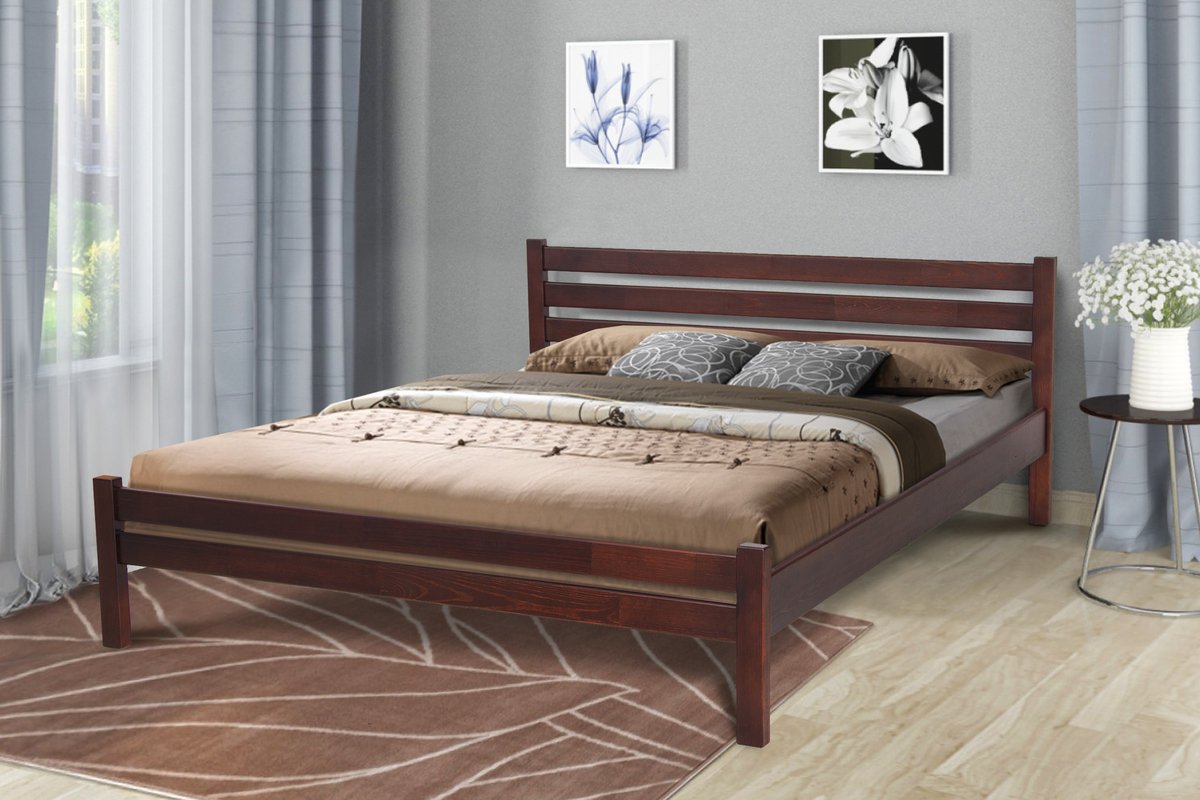 Розмір: Доступні розміри під матрац:800*2000, 900*2000, 1400*2000,1600*2000; Висота: узголів’я – 800 мм, узніжжя – 400 мм; Габарити: до ширини + 40 мм, до довжини +40 мм Колір: Темний горіх Матеріал: Масив, сосна
