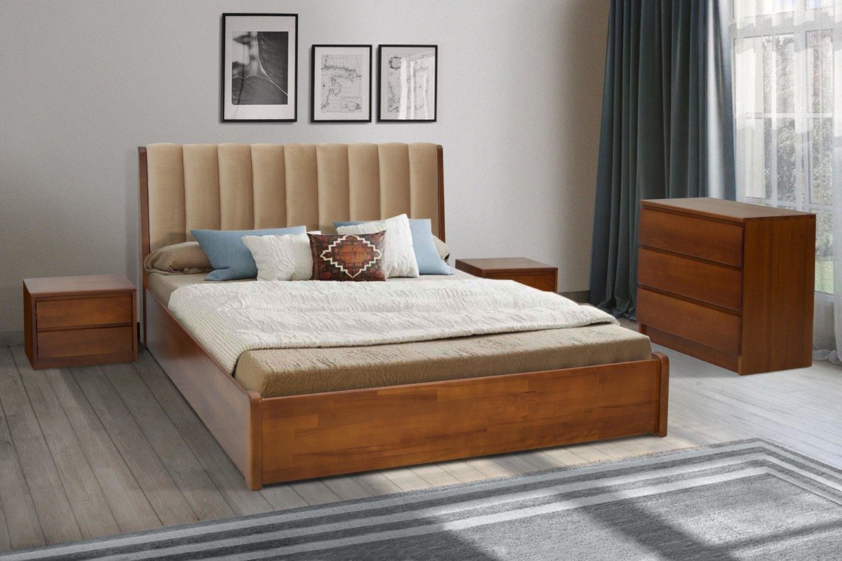 Розмір: Доступні розміри під матрац: 1200*2000; 1400*2000; 1600*2000; 1800*2000.Колір: Горіх, Горіх темний, Білий.атеріал: буковий щит.Матеріал оббивки в складській програмі:1. Тканина велюр Beatrice 03 (Apparel). 2. Тканина велюр Beatrice 07 (Apparel). Висота узголів’я: 1000 мм; Висота узніжжя: 330 мм. Відстань між ламелями: 55 мм. Товщина поролону в узголів’ї: 50 мм.Габаритні розміри:до ширини +70 мм; до довжини +160 мм.Глибина посадки матраца – 70 мм.