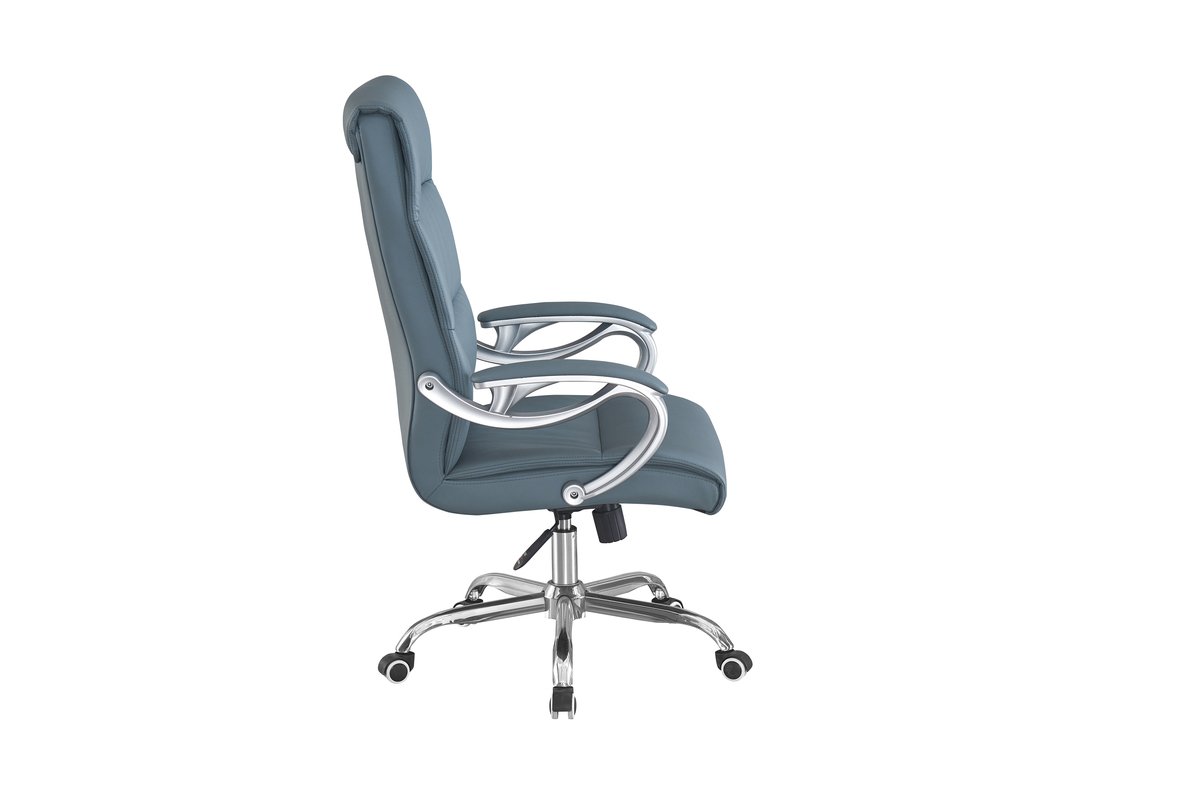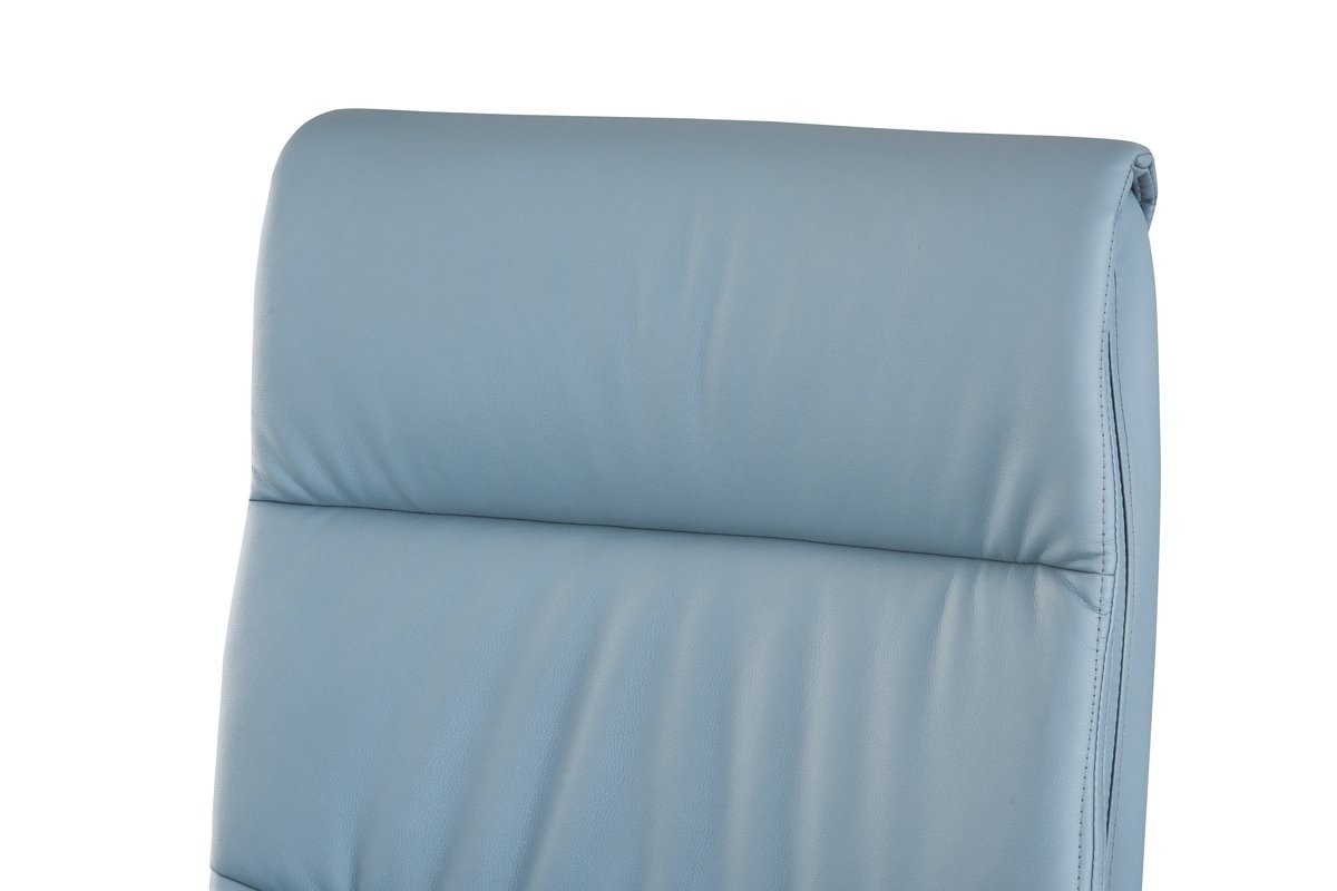 Розмір: Висота стільця: 112 см; Сидіння: Ш – 51.5 см; Спинка: В – 64 см; Висота підйому механізму: 10 см; Колір: Каркас: Хром; Сидіння: Сіро-блакитний, Оббивка: шкірзам. Матеріал: Каркас: Метал; Сидіння: Фанера гнутоклеєна. Ніжки – метал, хром. Підйомний механізм – газліфт