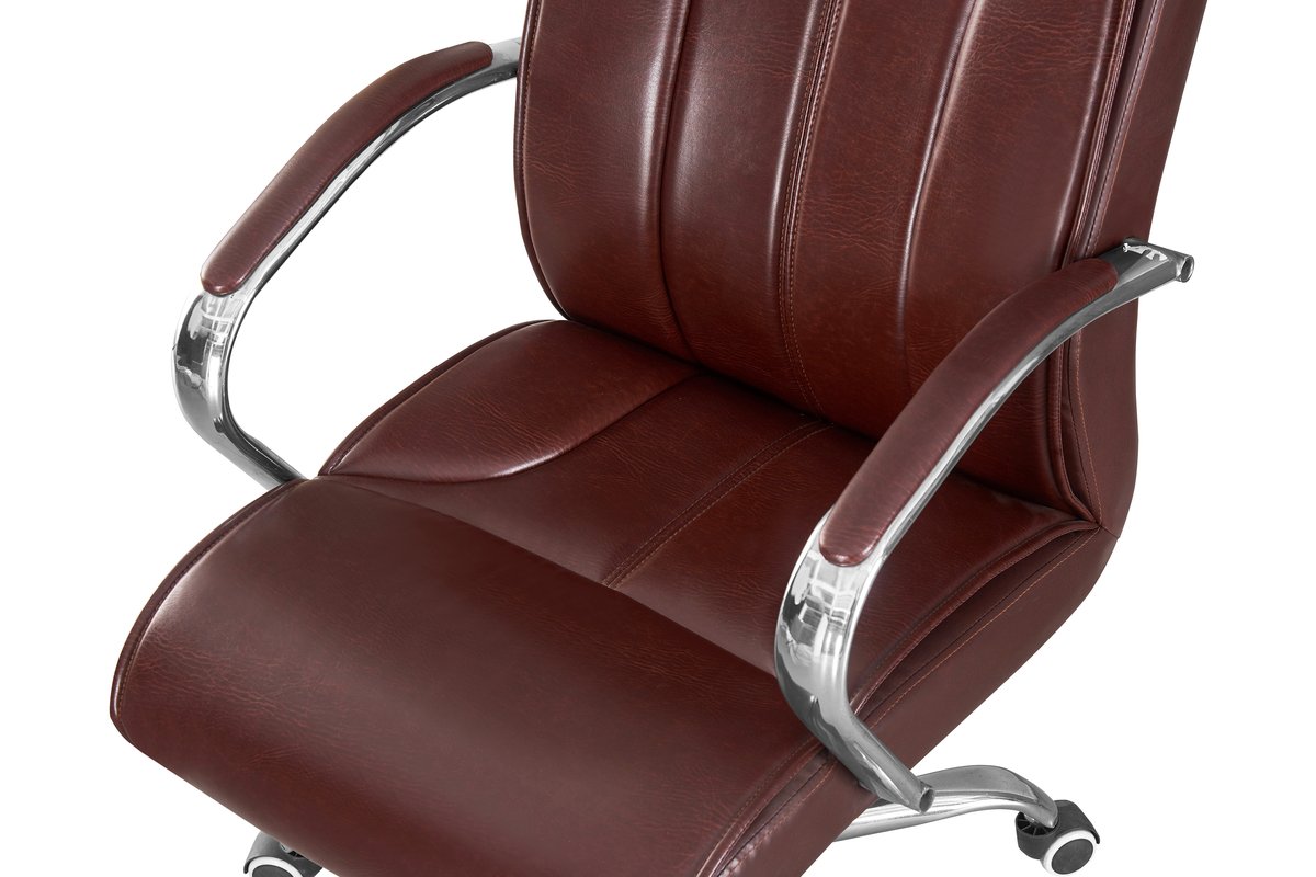 Розмір: Висота стільця: 117 см; Сидіння: Ш – 53 см; Спинка: В – 59.5 см; Висота підйому механізму: 10 см; Колір: Каркас: Хром; Сидіння: Коричневий, Оббивка: шкірзам. Матеріал: Каркас: Метал; Сидіння: Фанера гнутоклеєна. Ніжки – метал, хром. Підйомний механізм – газліфт