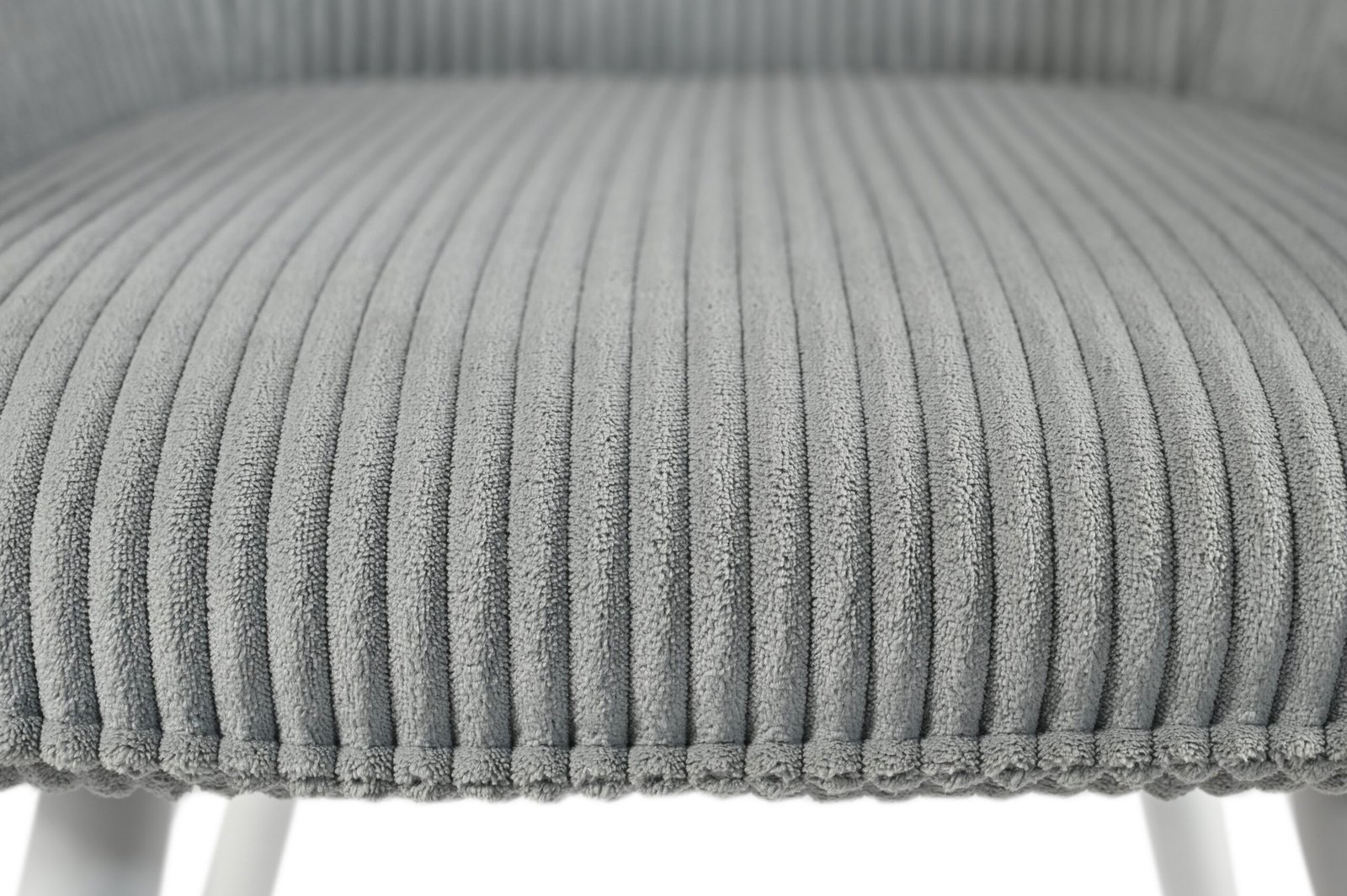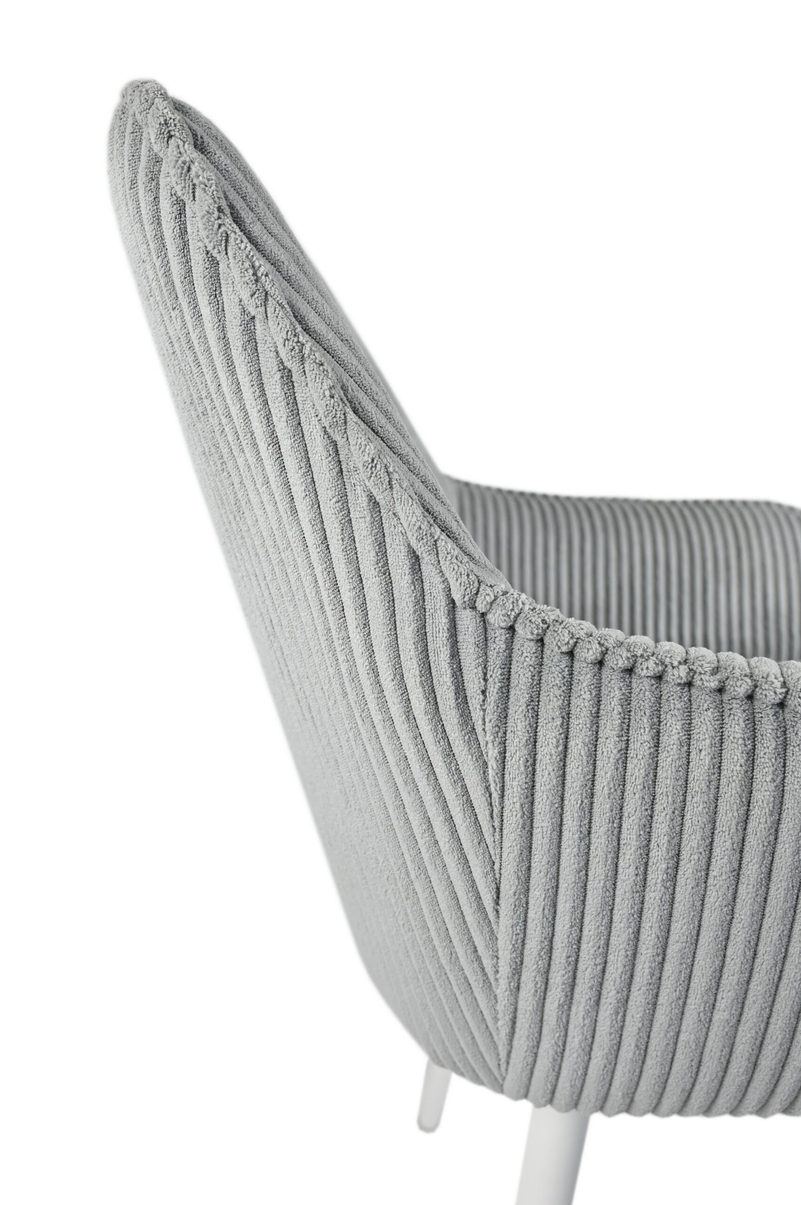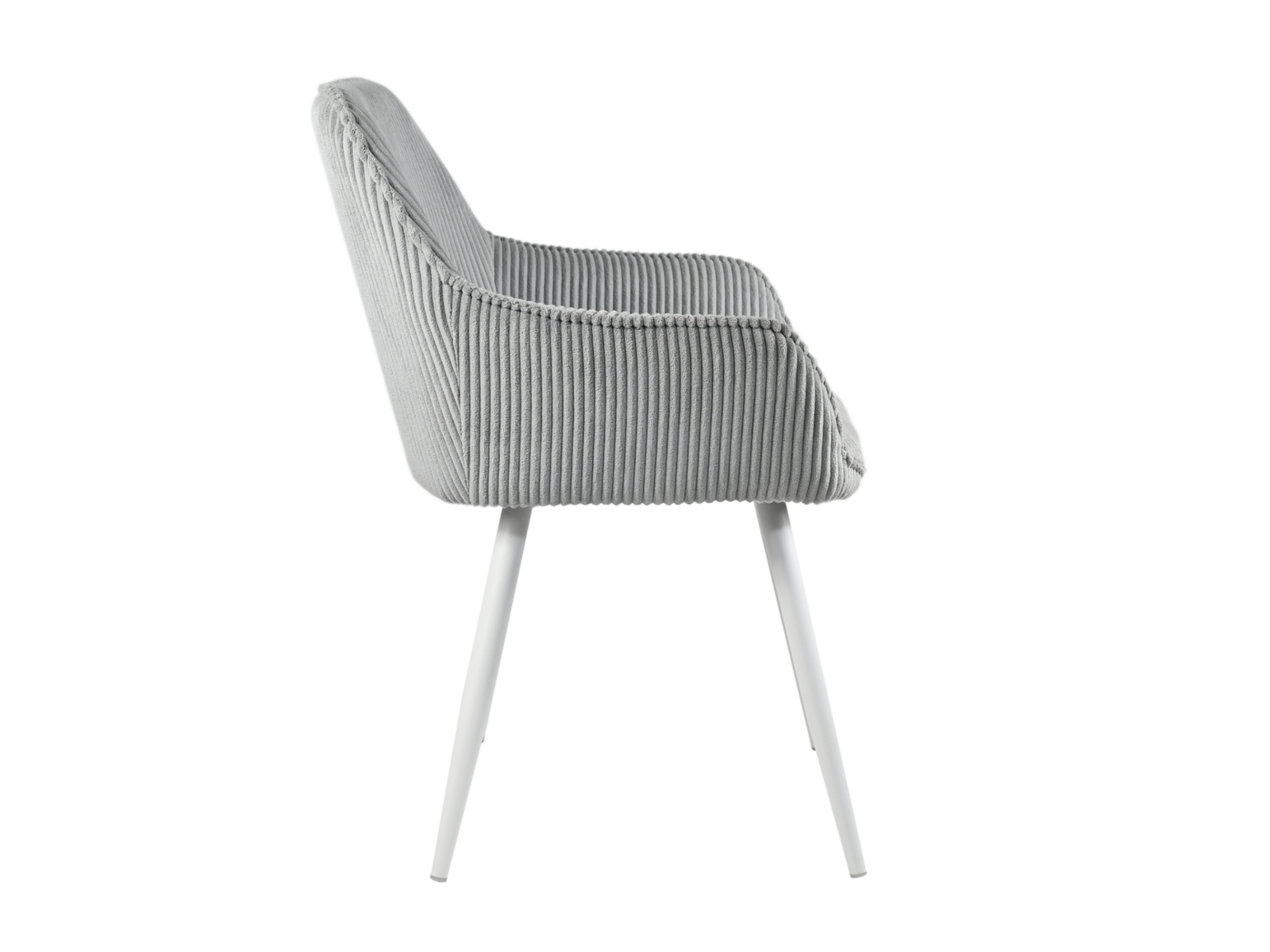 Ця модель поєднує в собі комфорт та сучасний дизайн. Оббивка з вельвету рубчик у сірому кольорі виглядає витончено і приємно на дотик. Текстура тканини додає об’єму, створюючи розкішний вигляд, що гармонійно поєднується з різними стилями інтер’єрів. Відтінок сірого додає спокою і витонченості, а металеві ніжки білого кольору надають стільцю легкості та елегантності.