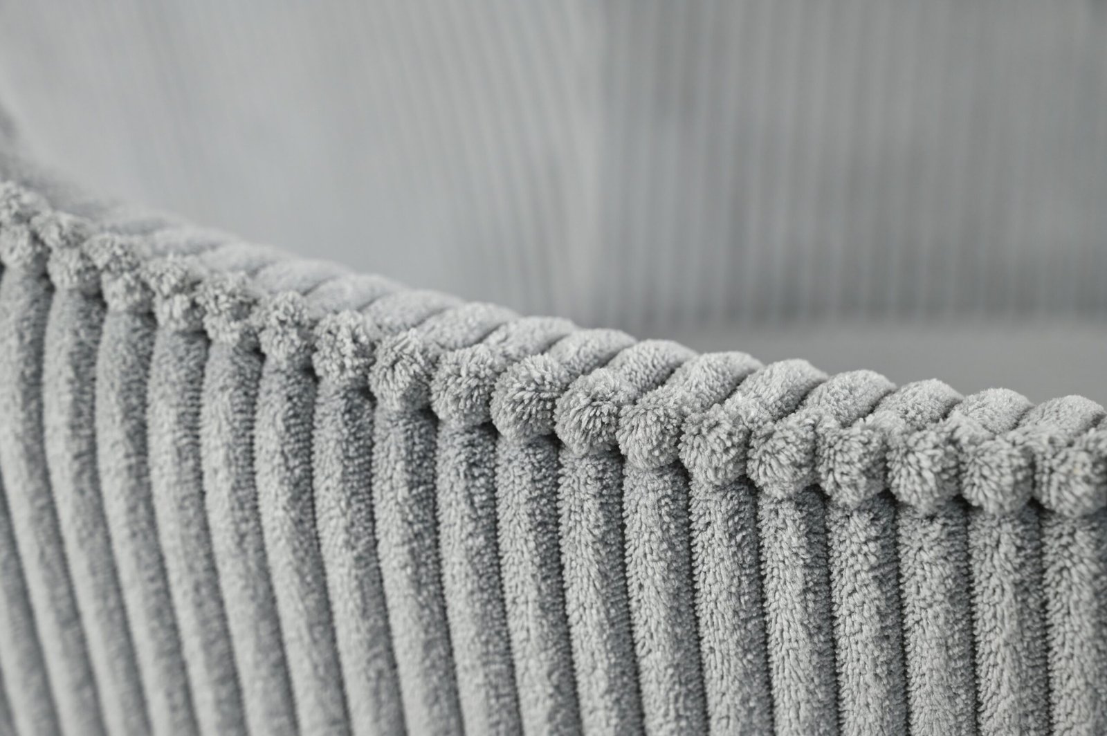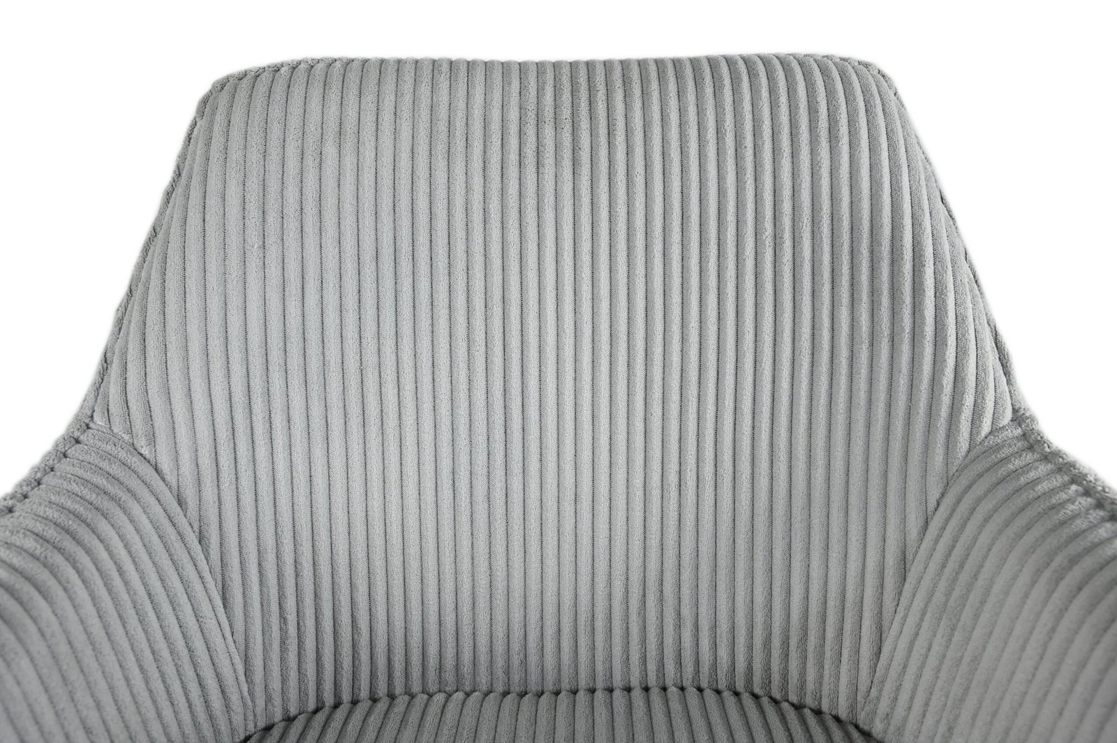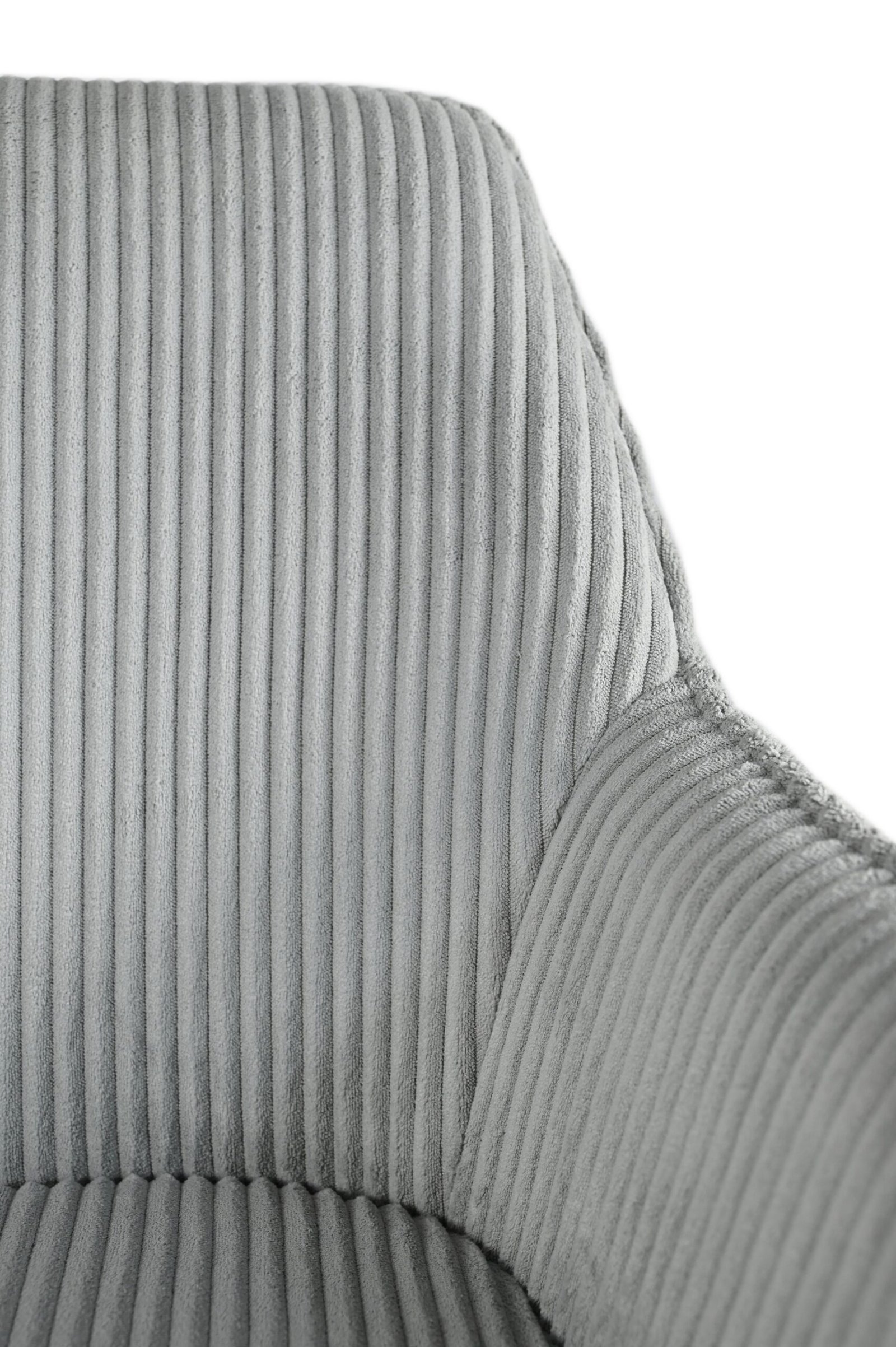 Ця модель поєднує в собі комфорт та сучасний дизайн. Оббивка з вельвету рубчик у сірому кольорі виглядає витончено і приємно на дотик. Текстура тканини додає об’єму, створюючи розкішний вигляд, що гармонійно поєднується з різними стилями інтер’єрів. Відтінок сірого додає спокою і витонченості, а металеві ніжки білого кольору надають стільцю легкості та елегантності.