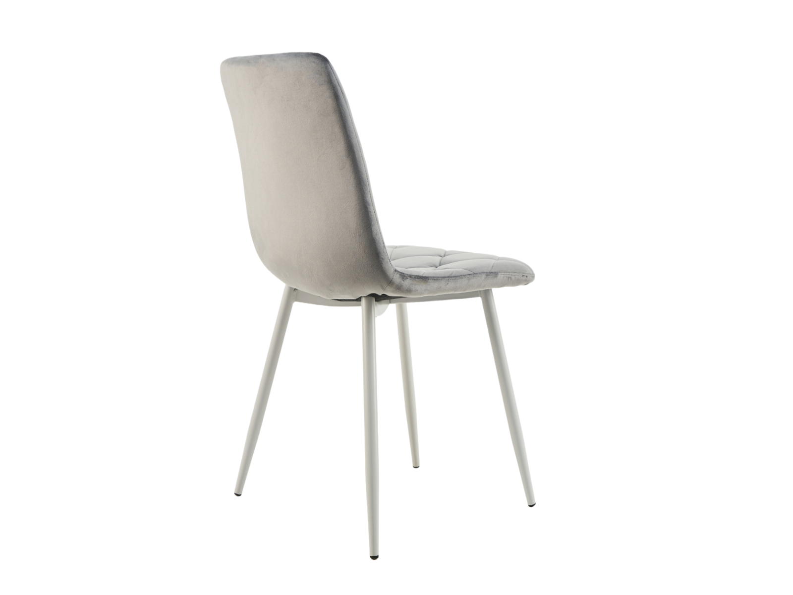 Стілець поєднує світло-сірий велюр з білим фарбованим металевим каркасом, створюючи гармонійний і витончений вигляд. Світло-сірий колір оббивки додає інтер’єру м’якості і спокою, а білий металевий каркас підкреслює чистоту ліній і додає легкості. Така комбінація ідеально підходить для сучасних інтер’єрів, доповнюючи як мінімалістичні, так і більш класичні стилі.