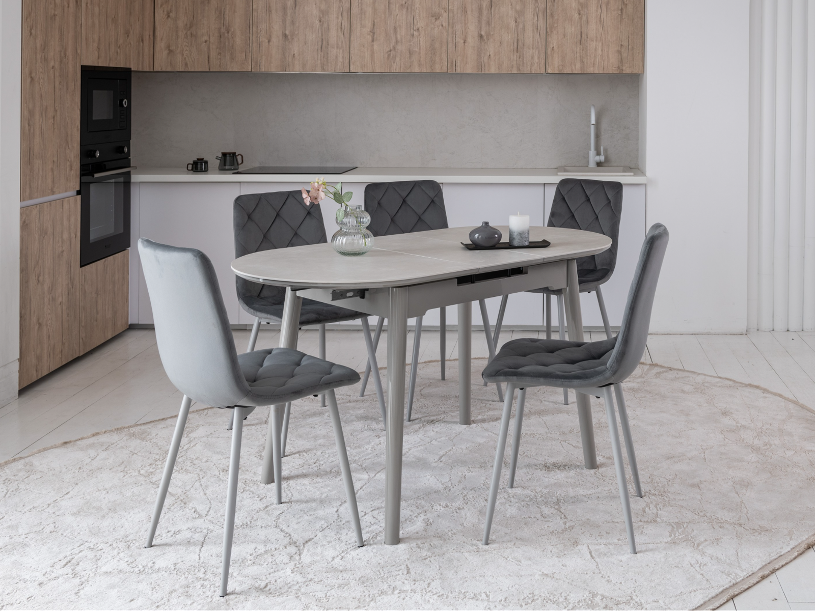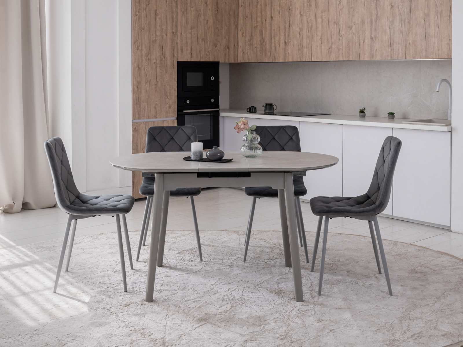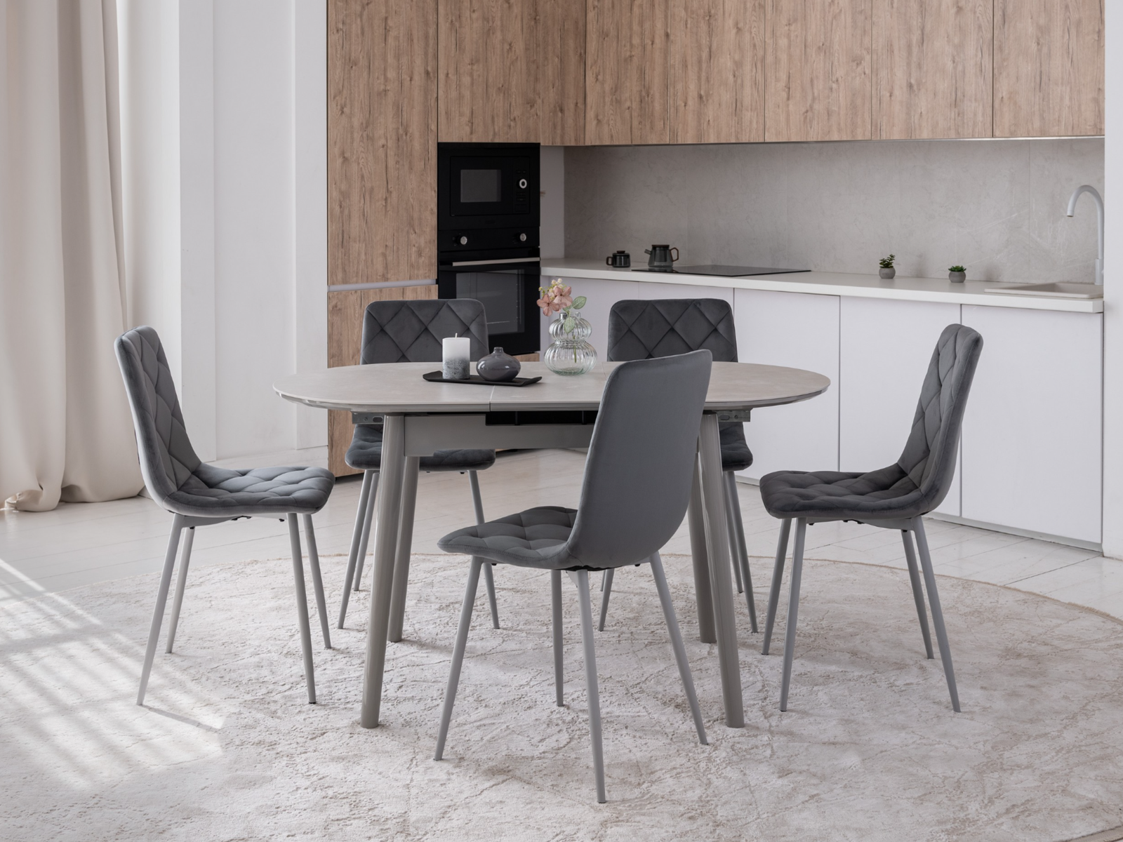 У поєднанні з фарбованим металом, що є основою стільця, цей виріб виглядає не лише естетично, а й демонструє надзвичайну міцність і довговічність. Темно-сірий відтінок оббивки, що немов облагороджує будь-який простір, вражає своєю глибиною та універсальністю — він додає відчуття стабільності та спокою, одночасно створюючи відчуття легкості завдяки контрасту з сірим каркасом.