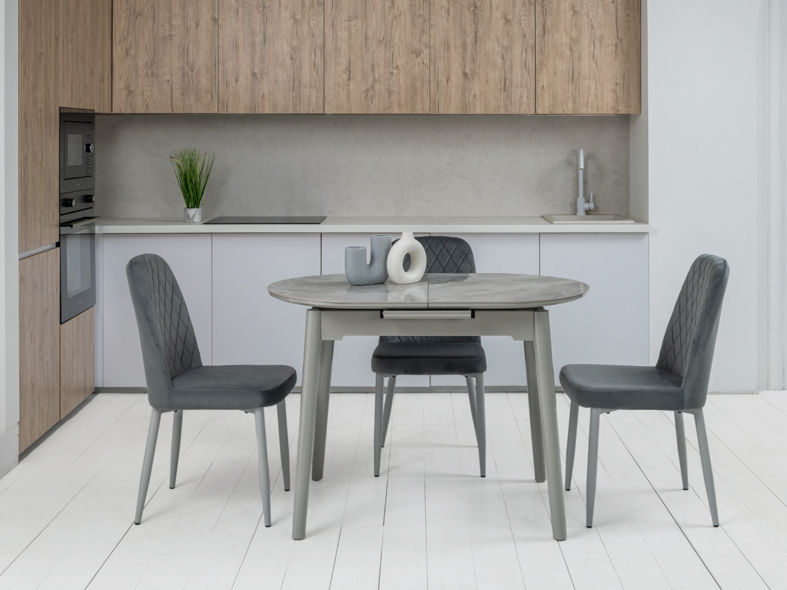 Сірий велюр не тільки радує погляд, а й дарує приємні тактильні відчуття, а текстура оббивки додає глибини і багатства, яке змінюється під різними кутами освітлення. Кожен момент сидіння на цьому стільці дарує відчуття розкоші, що поєднується з практичністю.