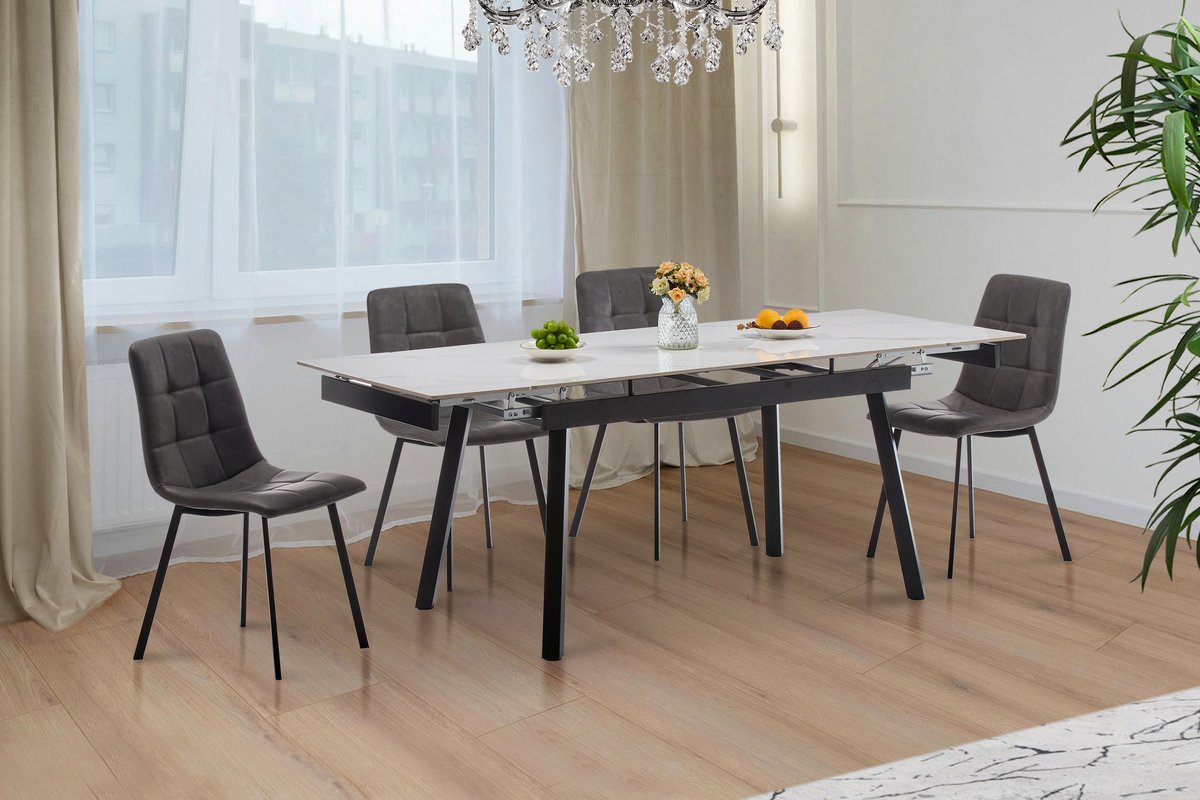 Розмір: 140(+30+30) × 80 см; Висота: 76 см; Колір: Ніжки: Чорний; Столешня: кераміка білий; Матеріал: Ніжки і каркас: метал; Столешня: кераміка товщиною 12 м