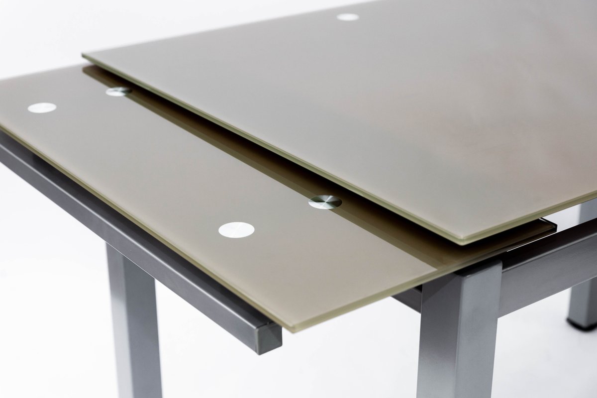 Скло термозагартоване (триплекс). Товщина скла = 10 мм. Ніжки – метал, колір сірийю. Розмір складений 80см*65см. Розмір розкладений 130*65 см. Висота: 75см
