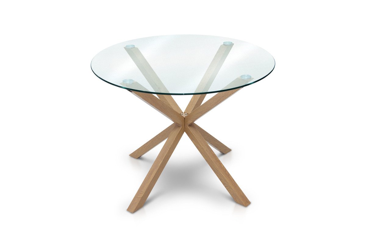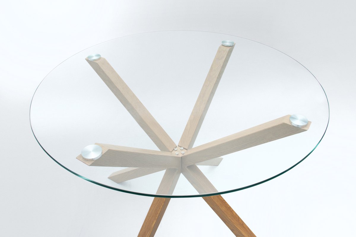 Основа столешні: Скло прозоре, термозагартоване (триплікс). Товщина скла = 10 мм. Ніжки – метал, термодрук колір деревини. Розмір стільниці D=100 см. Висота: 75 см. Загартоване скло прозоре. Ніжки термодрук на металі стуктури деревини