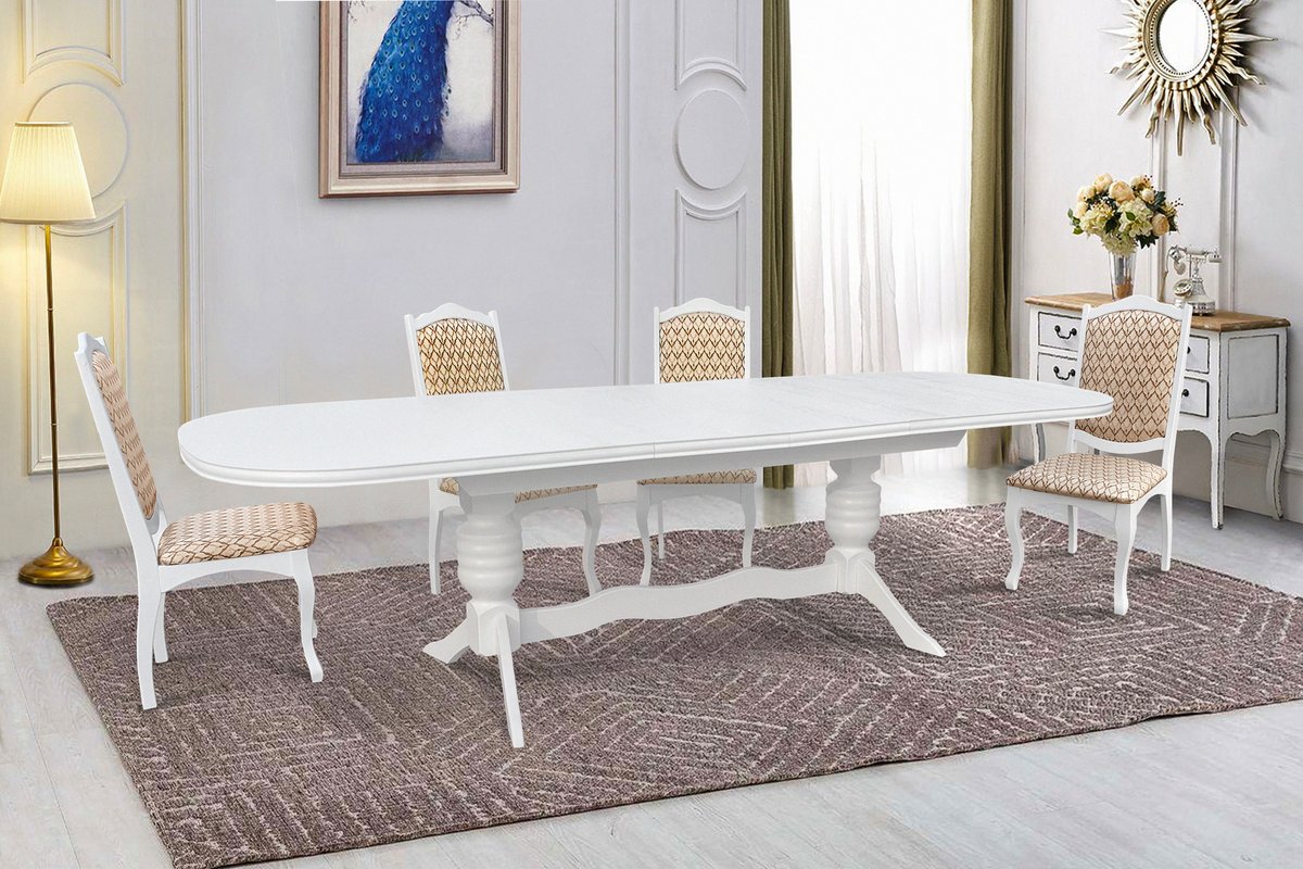 Стіл обідній Гетьман виготовлений з комбінації матеріалів, різьблені ніжки і подстолье – масив бука, стільниця МДФ, натуральний шпон. При розкладці столу можна використовувати дві центральні вставки, таким чином стільниця розміром 2000 мм збільшитися +400 і + 400. За столом зручно зможе розміститися 10 осіб. Розміри,мм :2000(+400+400)*1000 Колір: білий, темний горіх