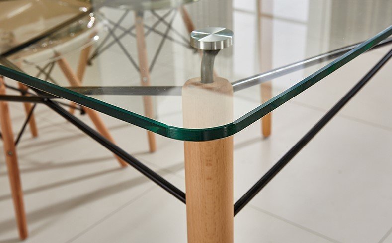 Стільниця: Скло прозоре, загартоване. Кріплення ніжок – металл товщина скла = 10 мм. Ніжки – деревина, бук. Висота: 75 см. Розмір стільниці: 120*80 см. Загартоване скло прозоре