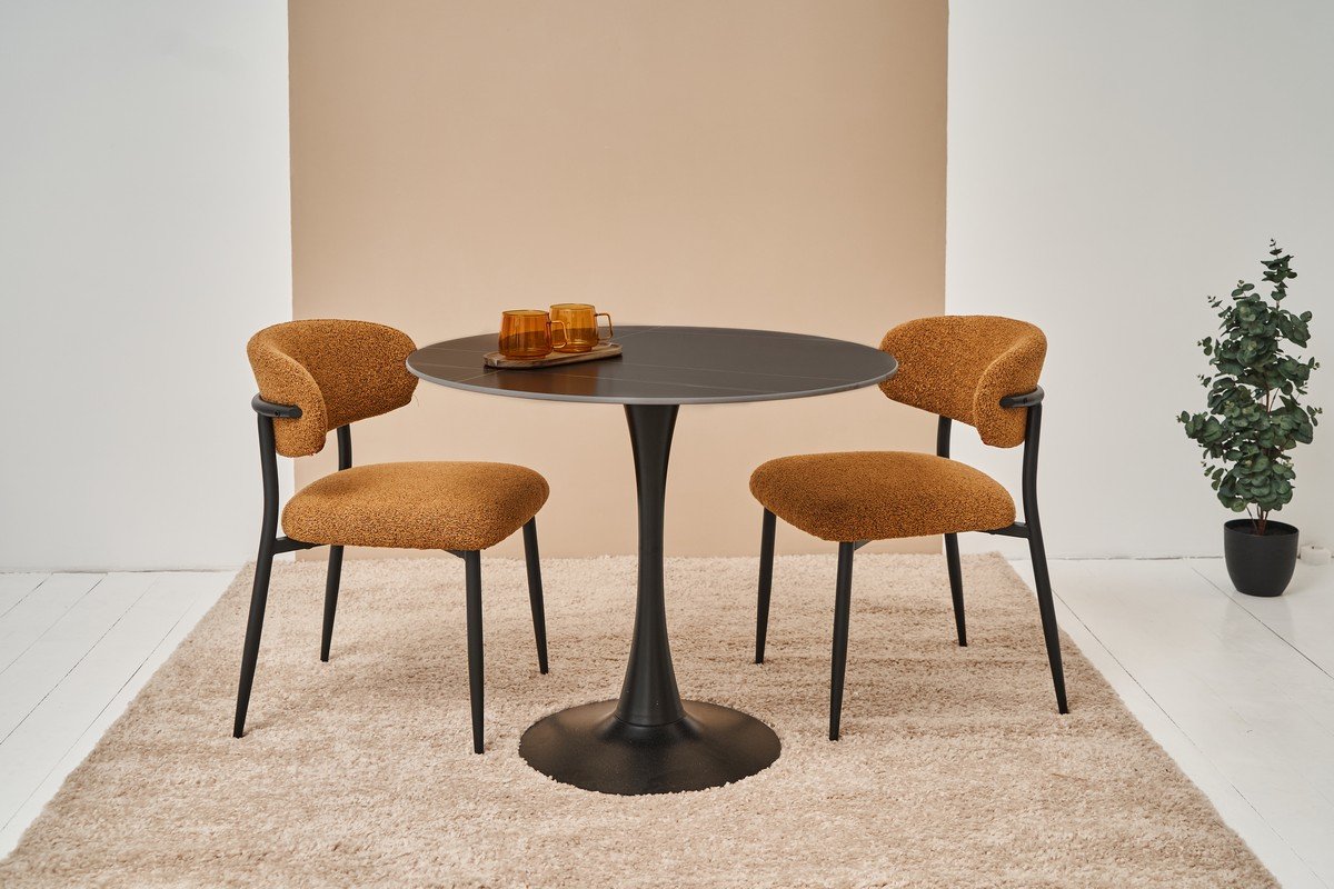 Стільниця виконана з матової кераміки в кольорі Лоран Блек, який імітує розкішний чорний мармур із глибокими прожилками. Такий відтінок надає столу вишуканий і стильний вигляд, що додає інтер’єру нотку розкоші. Матова поверхня стільниці не відбиває світло, що створює приємну атмосферу та зменшує видимість відбитків пальців і плям, полегшуючи догляд за столом.