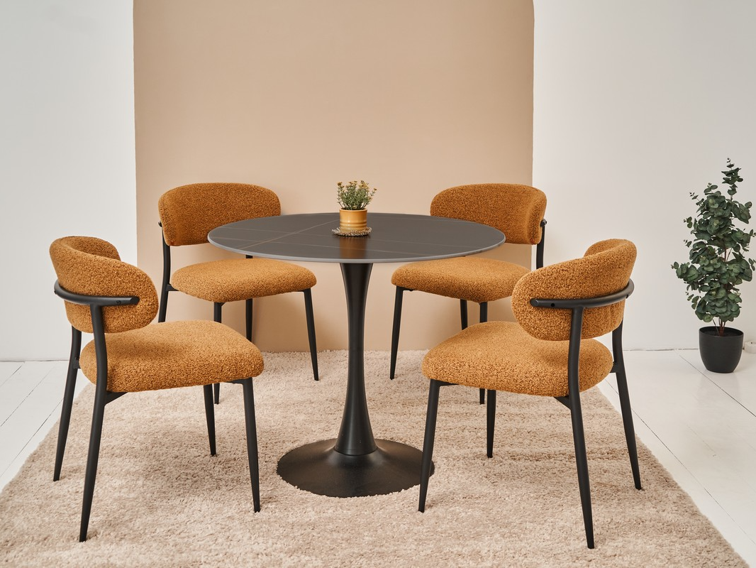 Чорна металева основа підкреслює сучасний стиль столу та забезпечує його стабільність. Контраст між темною стільницею і ніжками створює гармонійний і збалансований образ, який легко інтегрується в будь-який інтер’єр.