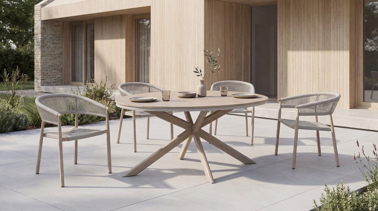 Стіл садовий обідній «Орта» ODT-30 у відтінках дріфтвуд грей та білий дуб — це елегантне поєднання сучасних матеріалів і природної стилістики, створене для комфортного відпочинку на відкритому повітрі. Його витончена овальна форма додає м’якості простору, сприяє невимушеному спілкуванню та робить обідню зону більш затишною і гармонійною.