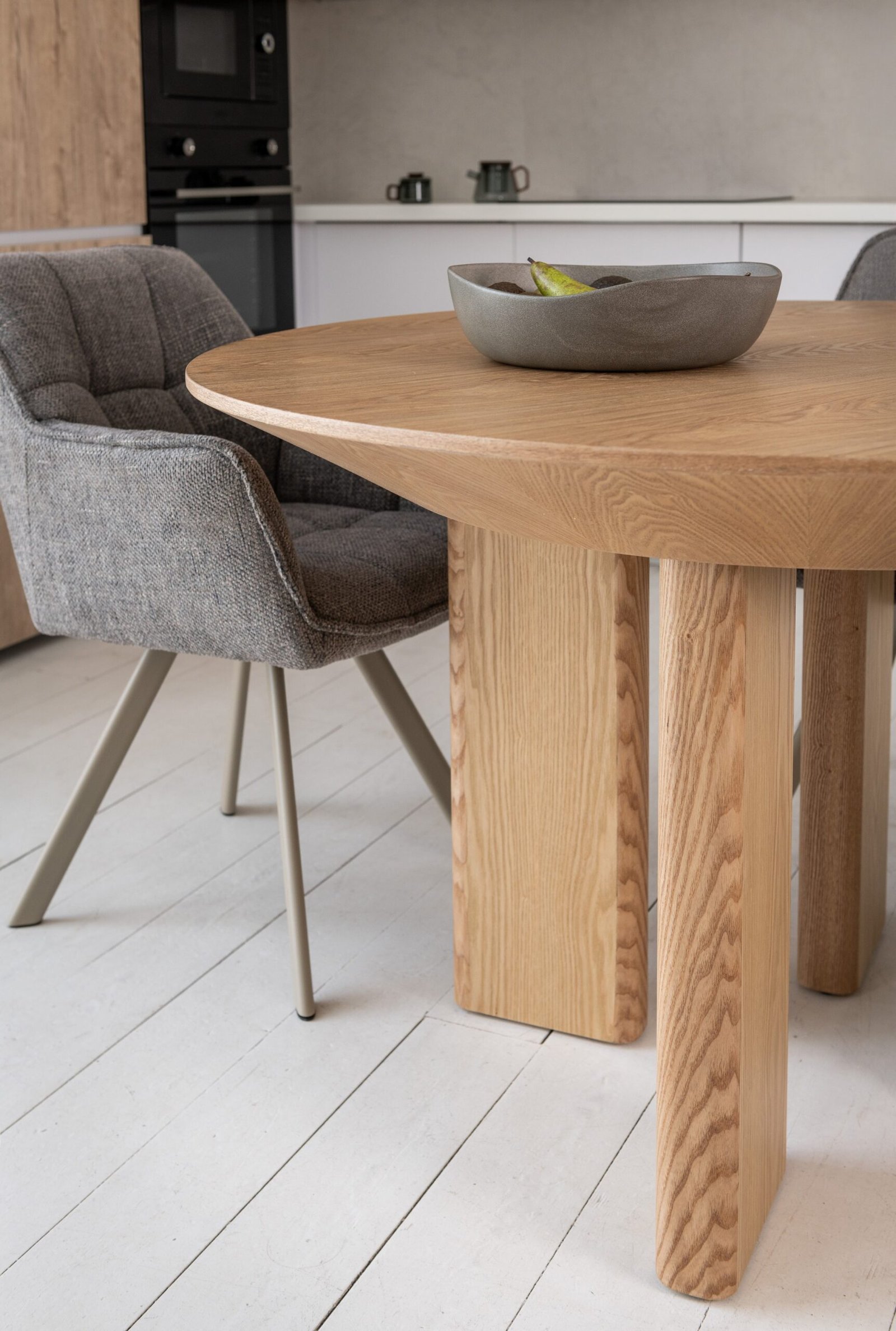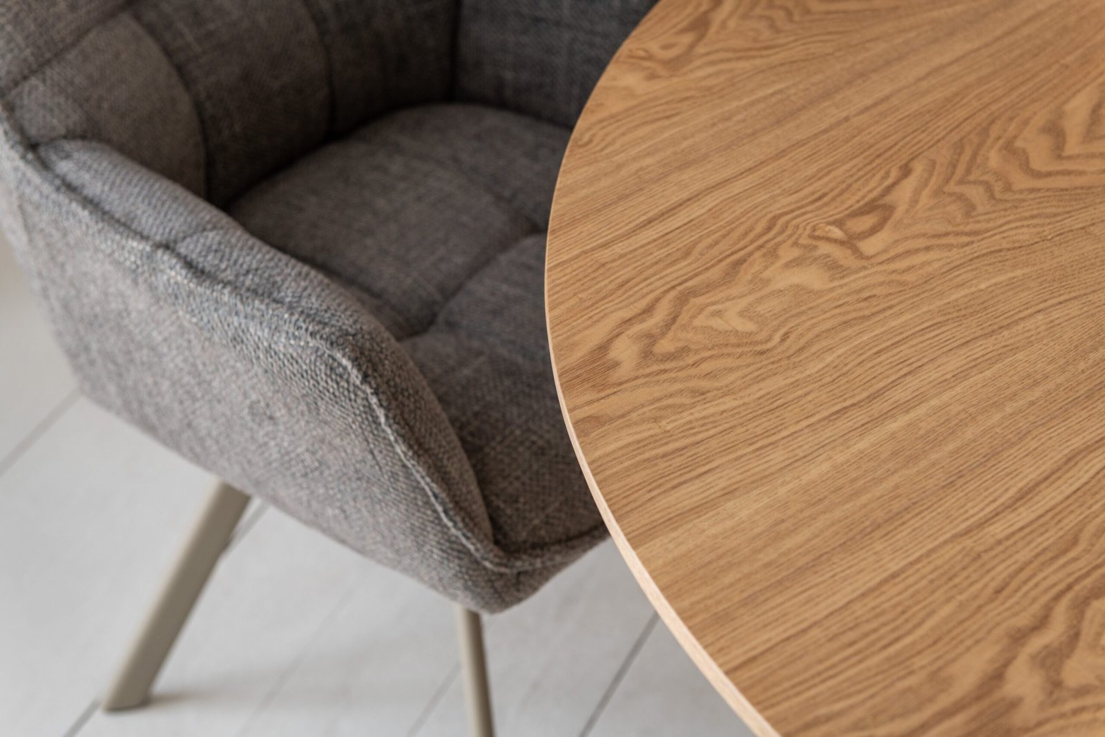 Кругла стільниця діаметром 120 см виконана зі шпонованого МДФ у природному відтінку “ясень”, що додає інтер’єру тепла та затишку.
