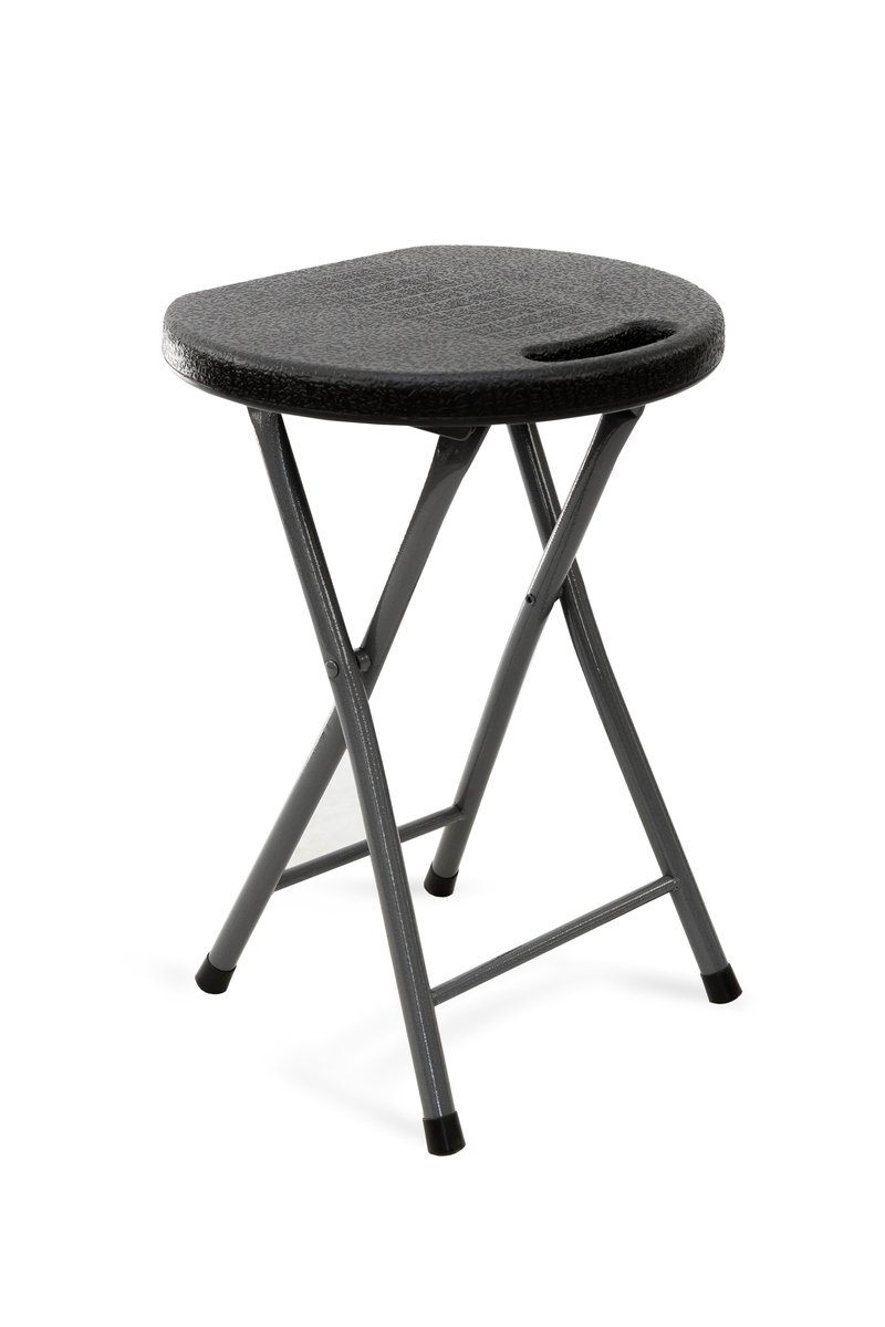 Розмір: Висота у складеному вигляді: 68 см; Висота у розкладеному вигляді: 45 см; Глибина стільця: 33 см; Ширина стільця: 33 см; Ширина сидіння: 33 см Глибина сидіння: 29 см; Висота сидіння: 45 см; Колір: Каркас: сірий; Сидіння: чорний; Матеріал: Каркас: метал; Сидіння: пластик.
